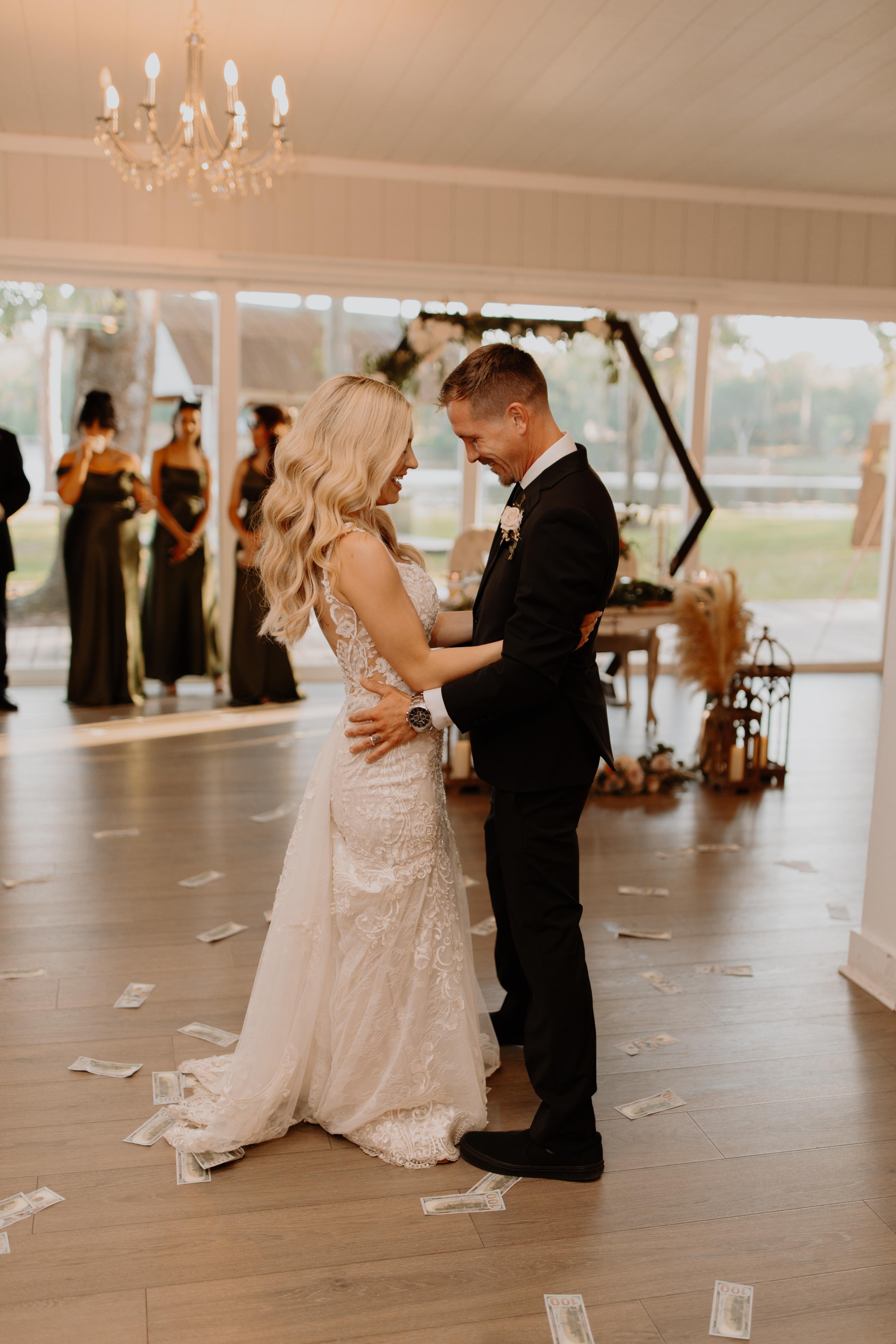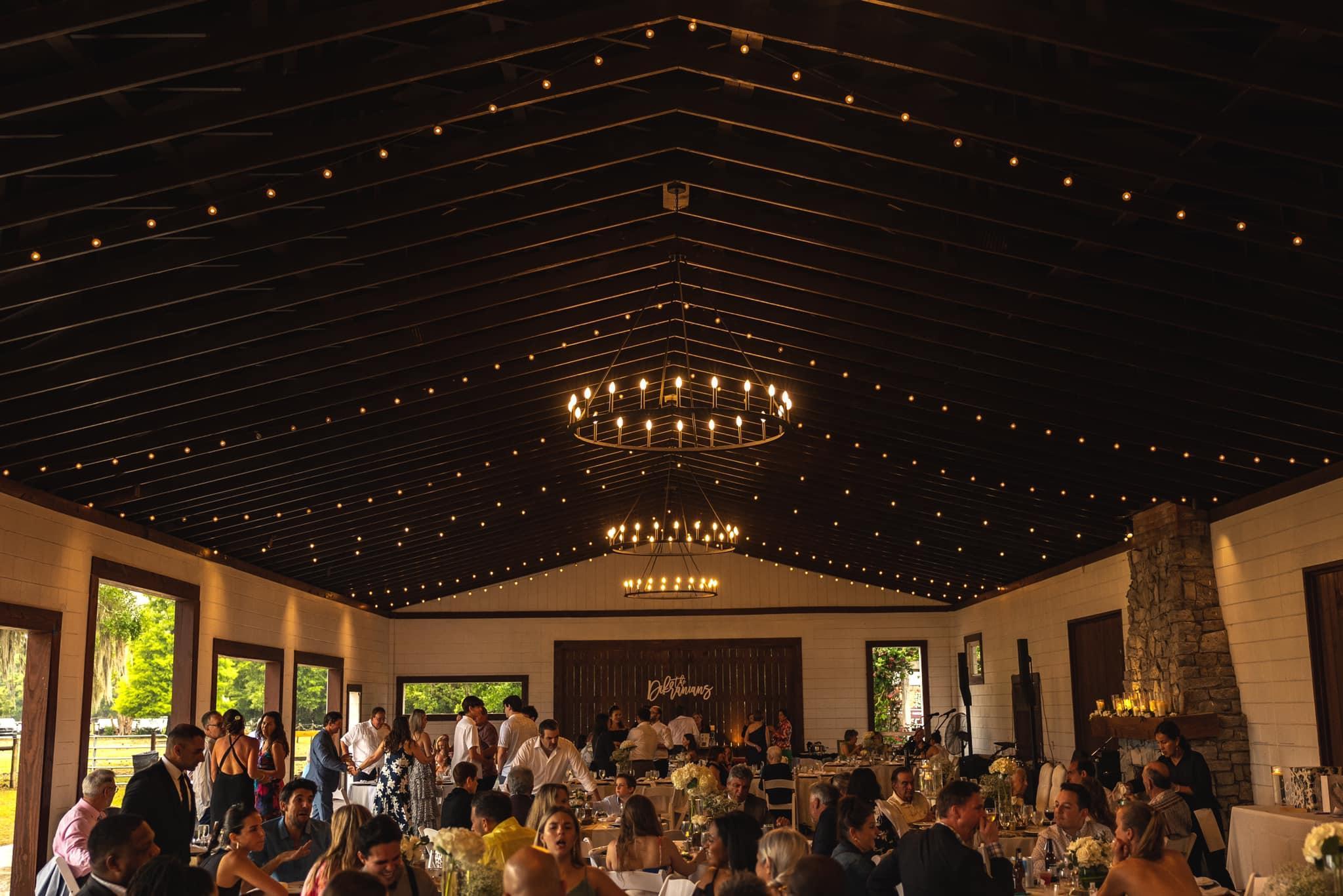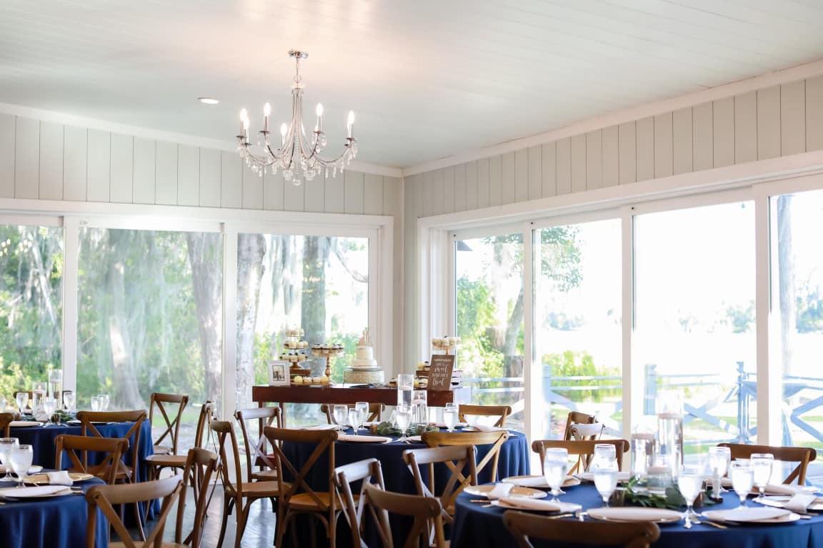 The Barn is a 4,000 square foot our air-conditioned reception space that will keep guest cool while still showing off that amazing lake view through the glass sliders surrounding the entire barn. The gorgeous crystal chandeliers give the perfect romantic glow for introductions and first dances. It's the perfect space to celebrate with your favorite people.