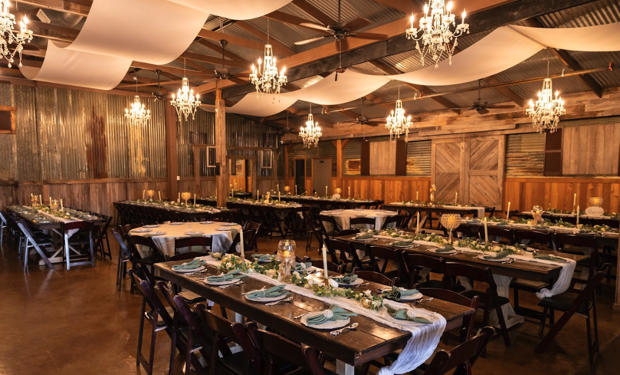 Rustic Elegance: Features charming wooden decor and sparkling chandeliers. Spacious and Versatile: Ample space to accommodate large gatherings with various seating arrangements. Inviting Atmosphere: Warm and welcoming with beautiful lighting and decor. Fully Equipped: Climate-controlled to ensure comfort in any season. Perfect for Celebrations: Ideal for receptions, dinners, and other special events.