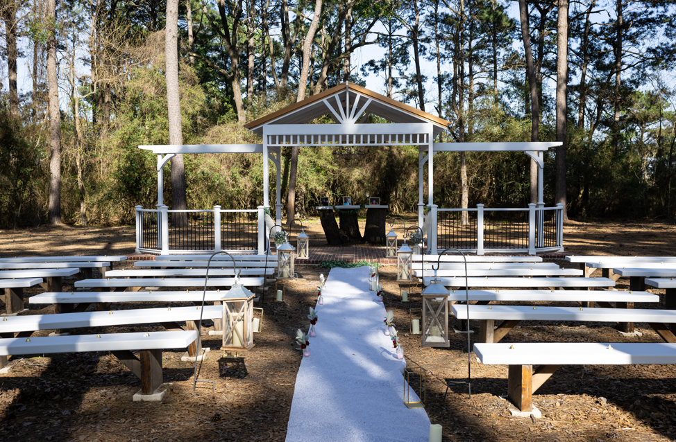 Rustic Elegance: Charming wooden architecture with a beautiful chandelier. Spacious and Inviting: Open design with natural light and a warm atmosphere. Comfortable Seating: Bench seating ensures a perfect view for all guests. Scenic Backdrop: Large wooden doors frame stunning natural surroundings. All-Weather Comfort: Covered structure for any weather conditions. The Covered Altar blends rustic beauty and elegance, making your ceremony memorable and enchanting.