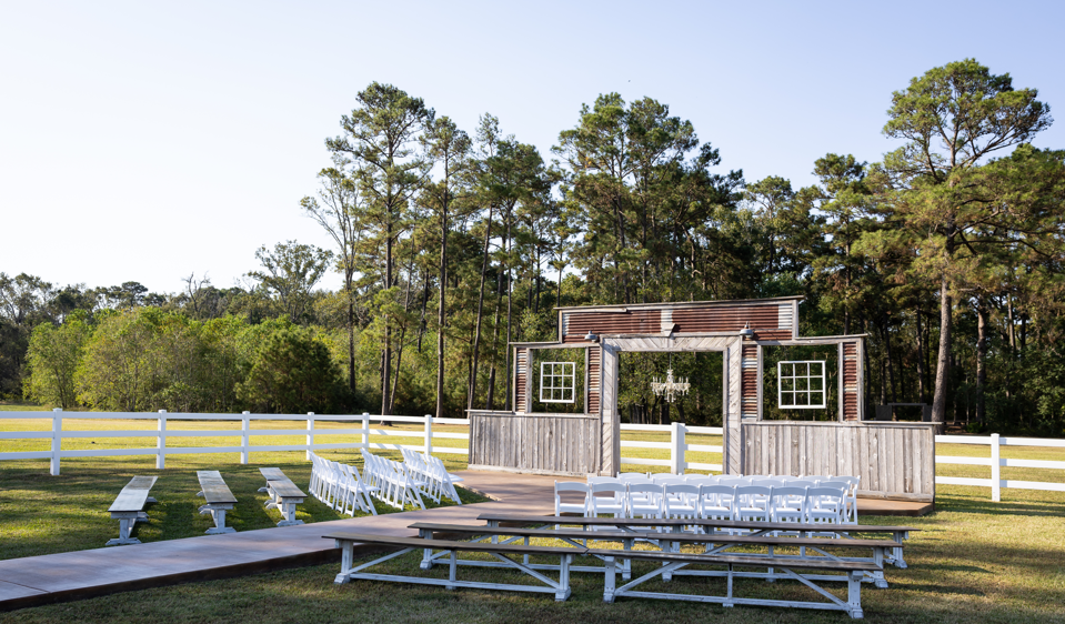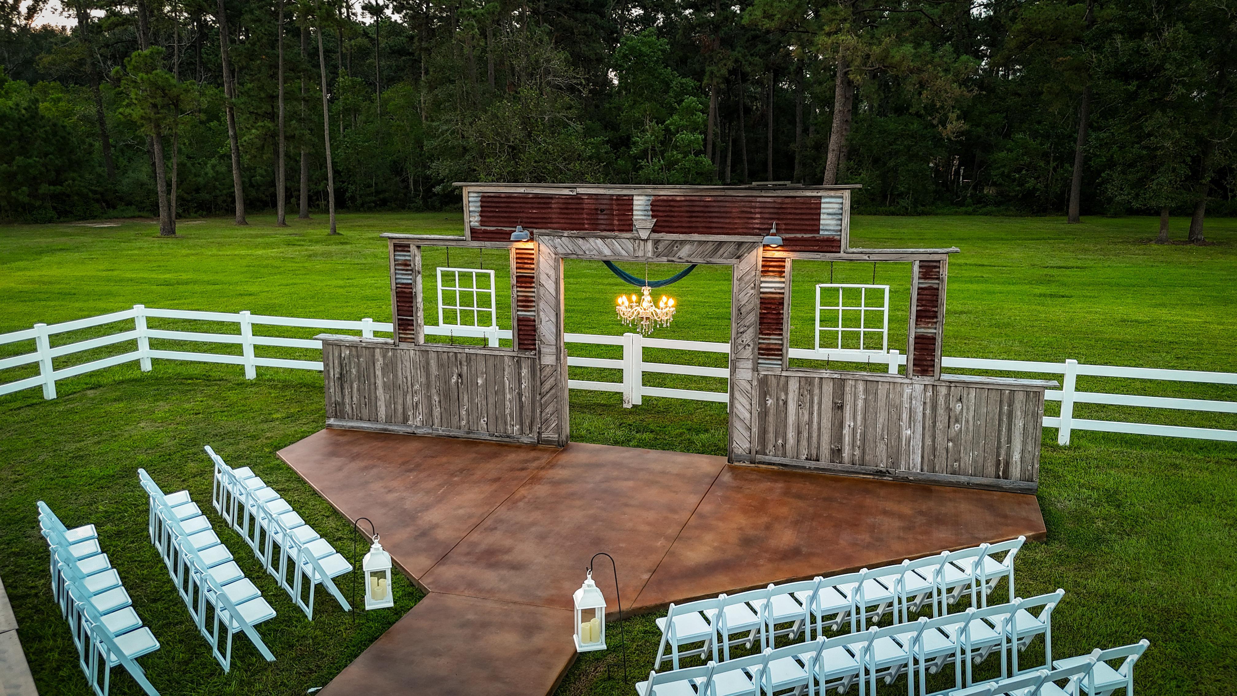 Our Corral Altar provides a unique and romantic setting for your wedding ceremony. Rustic Romance: Wooden structure with elegant drapery and a sparkling chandelier. Open and Spacious: Ample space for your ceremony with a beautiful open design. Intimate Atmosphere: The cozy corral setting creates an intimate and romantic ambiance. Scenic Beauty: Perfect backdrop for stunning wedding photos, especially at night.