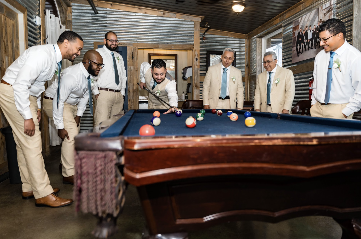 Our Man Cave is the ultimate retreat for grooms and groomsmen, offering: Comfortable Lounge: Relax in a cozy lounge with comfortable seating. Entertainment: Enjoy a large-screen TV, pool table, and poker table. Rustic Charm: A blend of rustic decor and modern amenities. Bar Area: A bar area with a fridge for your pre-event drinks. Private Facilities: Includes a private bathroom and shower. Outdoor Activities: Easy access to play horseshoe, cornhole, or fish in our 5-acre pond.