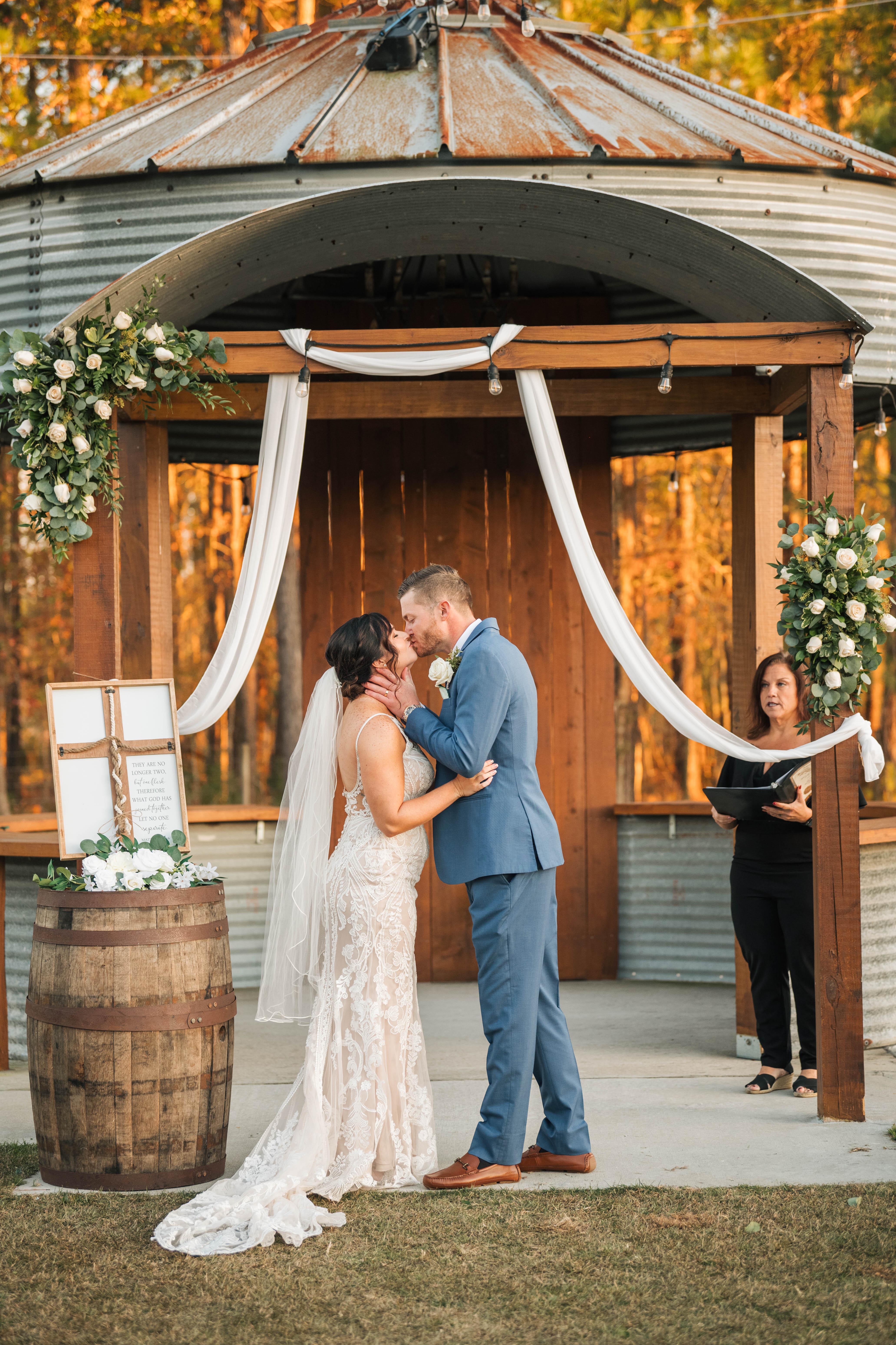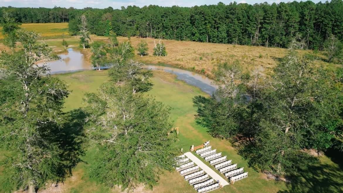 The Barn at Reeves Farm is the perfect location for any wedding ceremony/reception. It’s location near St. George, SC makes it a convenient site for guests in the Charleston/Summerville area, just 4 miles from exit 77 of of I-95. The property consists of a large barn situated on 80 acres of land which provides ample space for an indoor or outdoor wedding. The barn can hold 300 people and table seating is provided for up to 80 people. It features large windows that allow ample natural light to stream into the main room with over 3200 square feet of available space, a handicap accessible men and women’s wash closet, a built-in stage, a bar, and space for a dance floor. The outside property has a pond, oak trees, gazebo, and sprawling fields, any of which can be used for an outside ceremony, cocktail hour, or reception. The outdoor area has additional space to increase the occupancy capacity. A bridal suite is included for the bridal party to use prior to the ceremony.