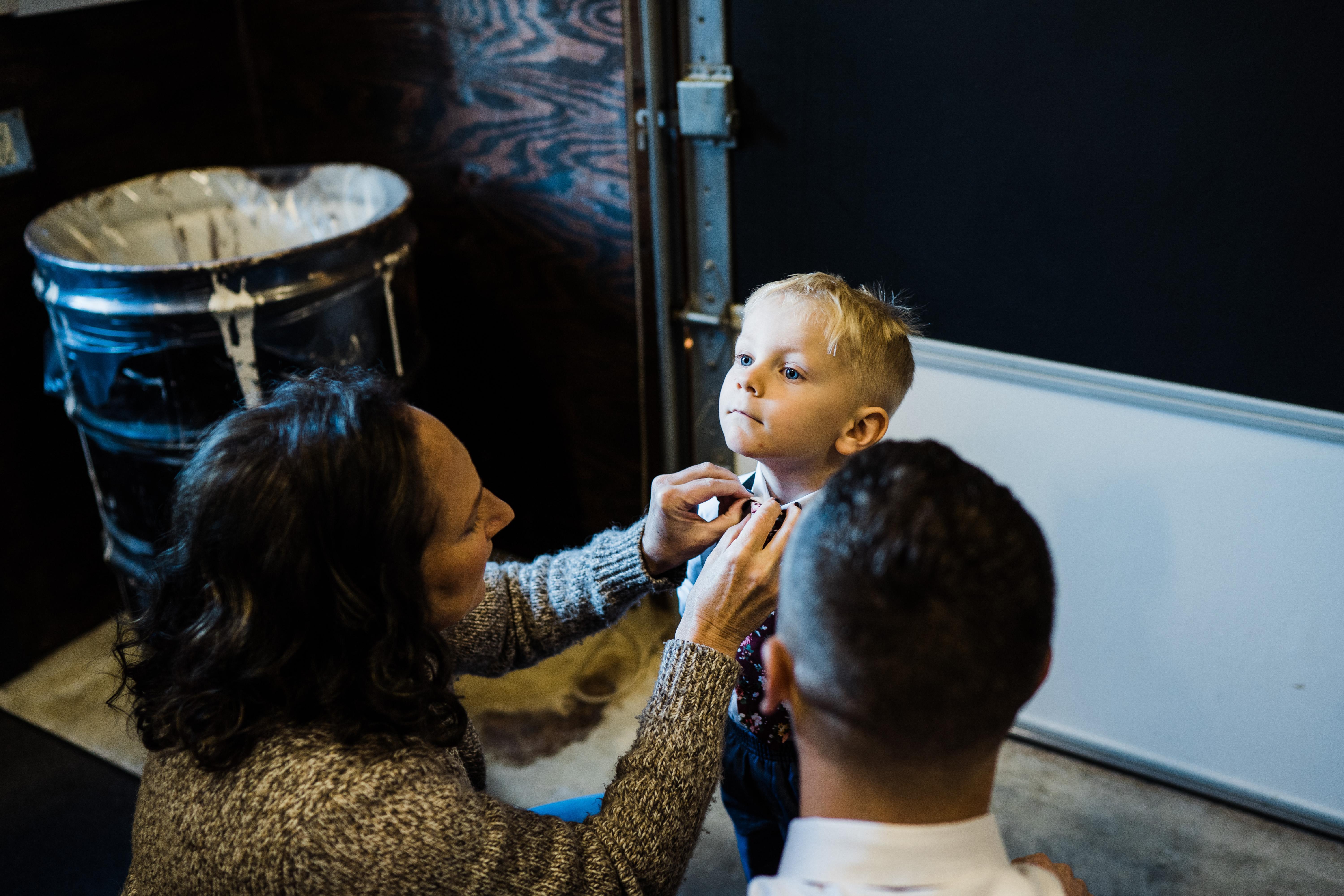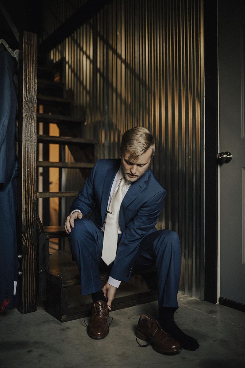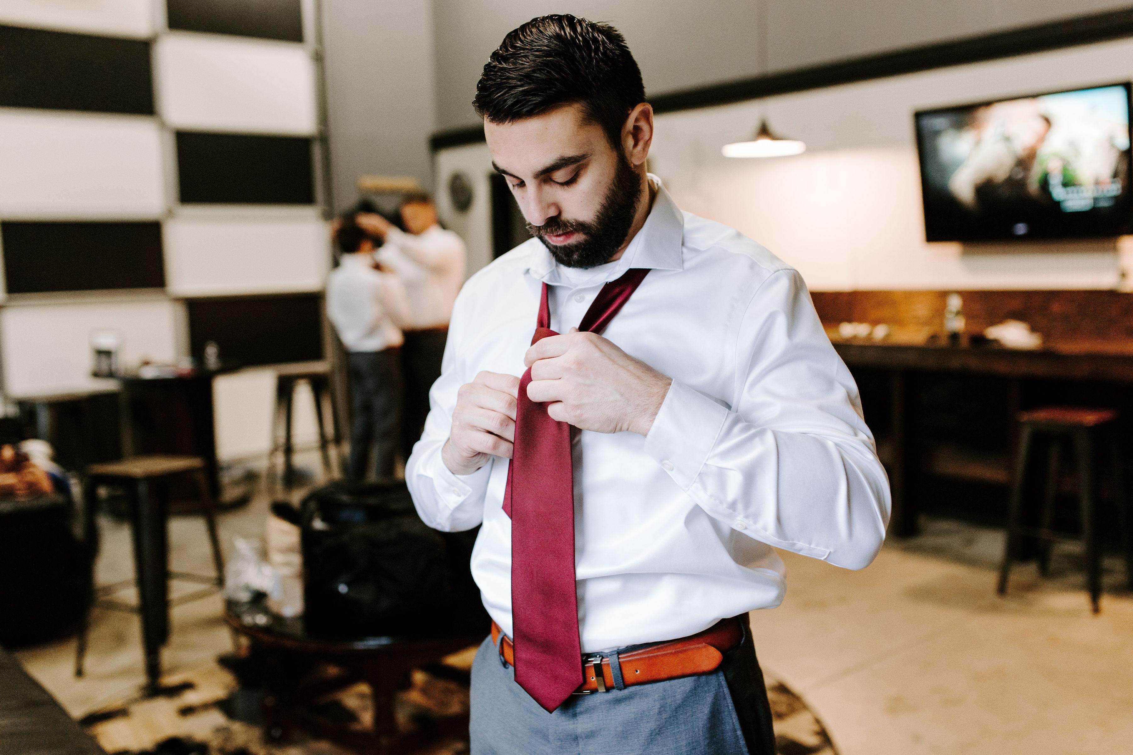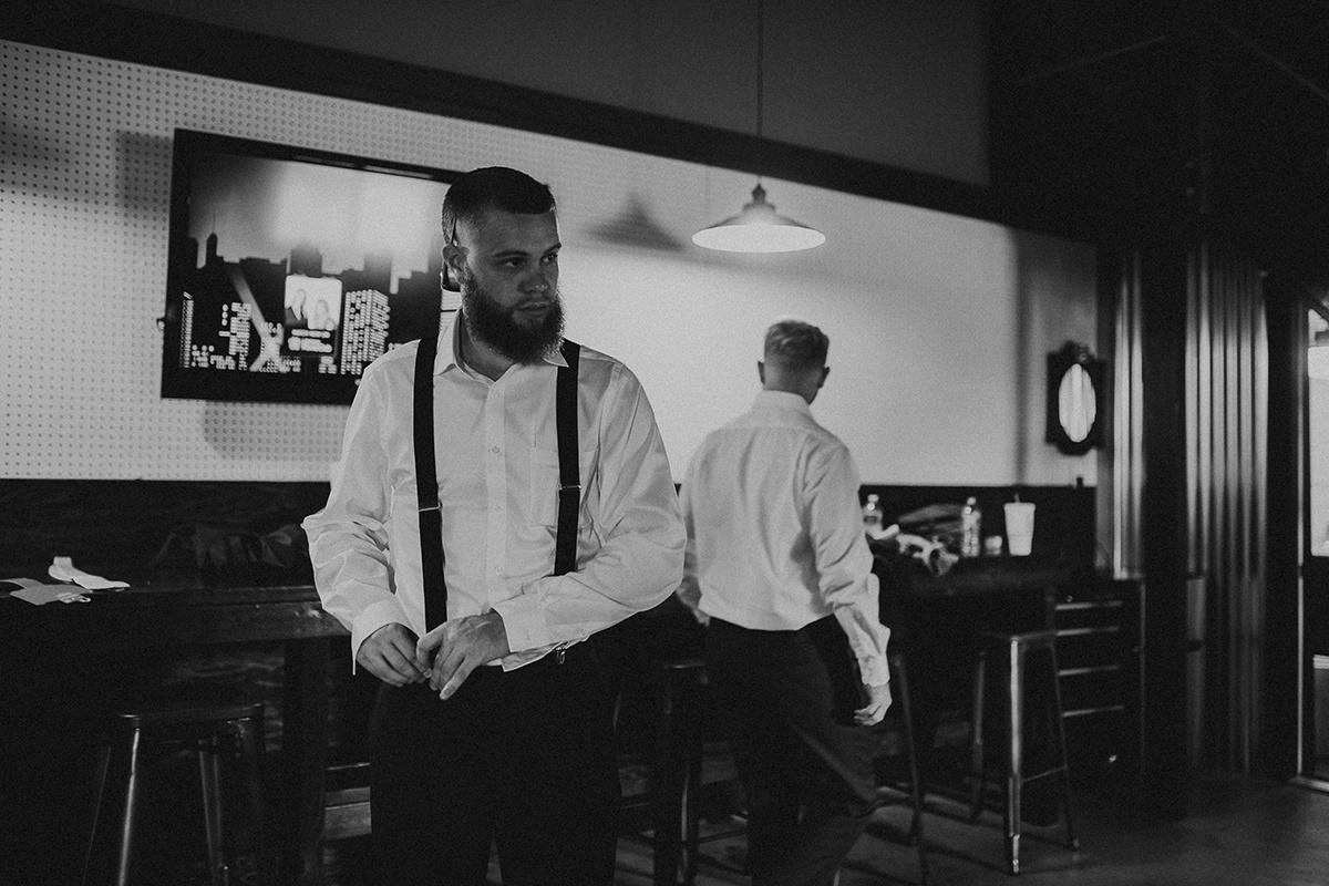 This industrial space is perfect for the guys to hang out before the Wedding with a TV to keep them entertained.