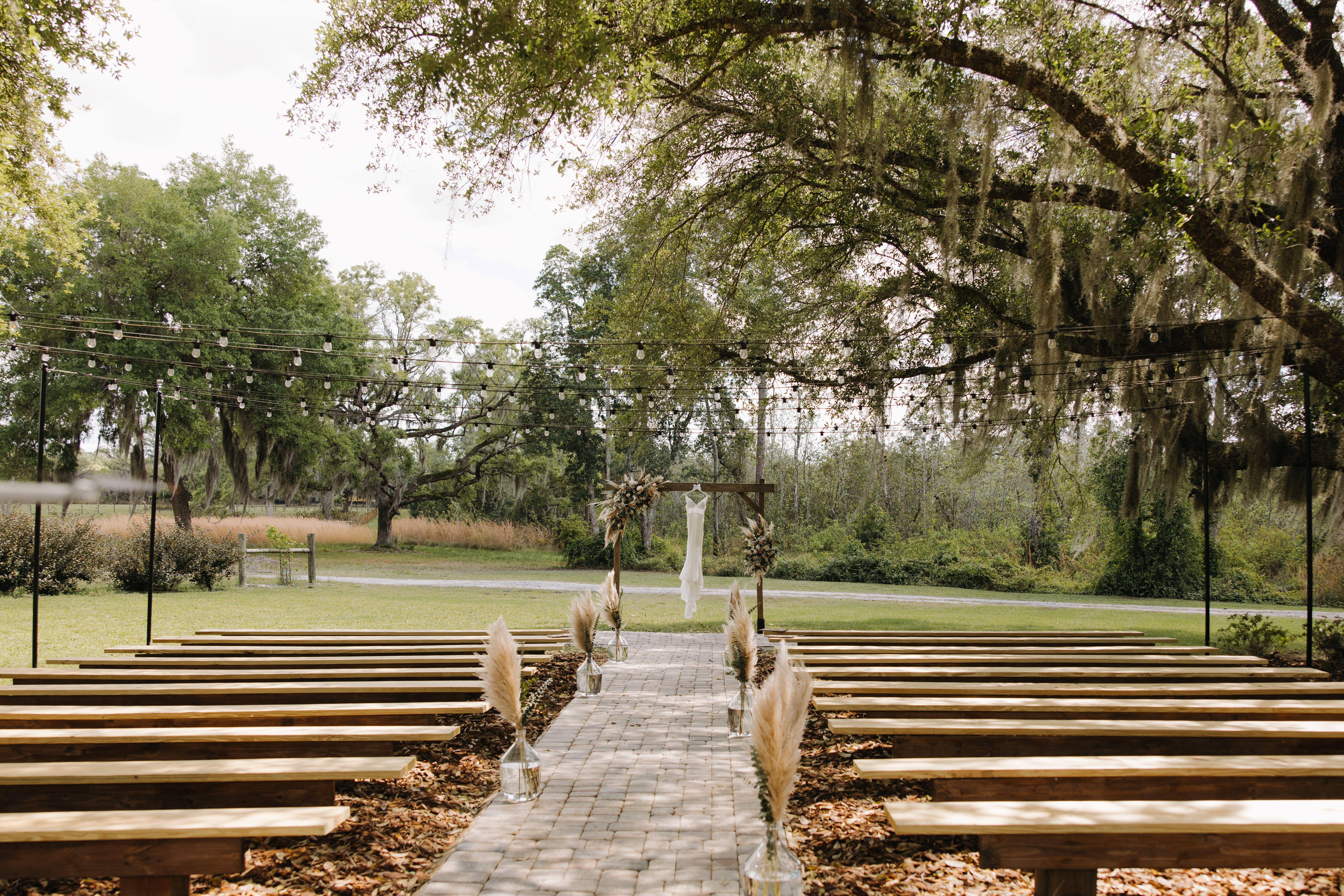 Our ceremony space provides seating and comfortable seating under the beautiful canopy of Oak trees