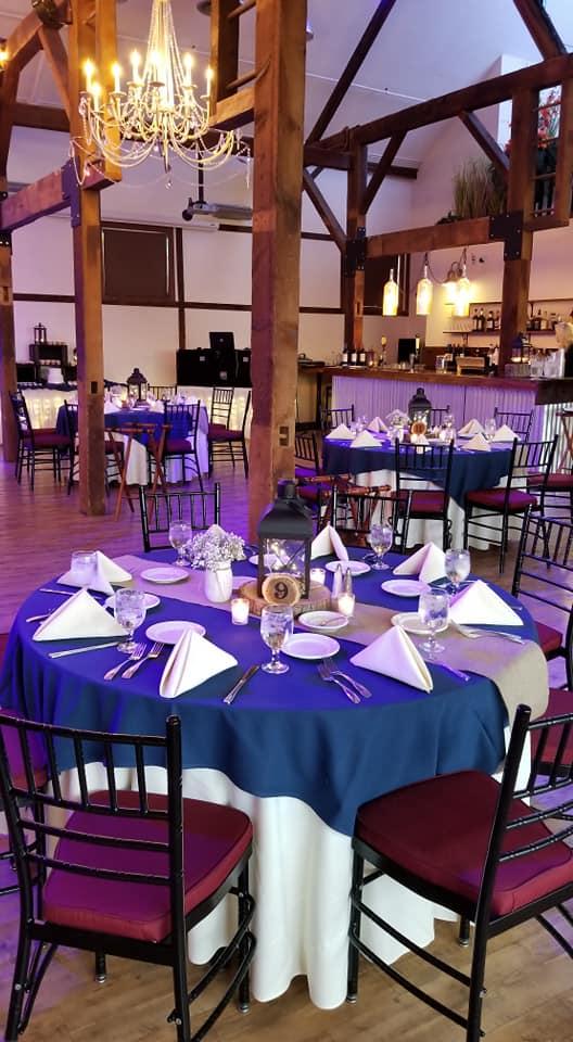 All tables and chairs included in Room Rental fee • Room set-up and tear-down • Standard room rental is a five-hour window • Bar area with high top tables for happy hour and mingling • Patio area (weather permitting) • Full sound system throughout The Barn – can be used by DJ or by guests • Full lighting system includes chandeliers, room lighting, and 60+ theatrical lights for the dance floor area