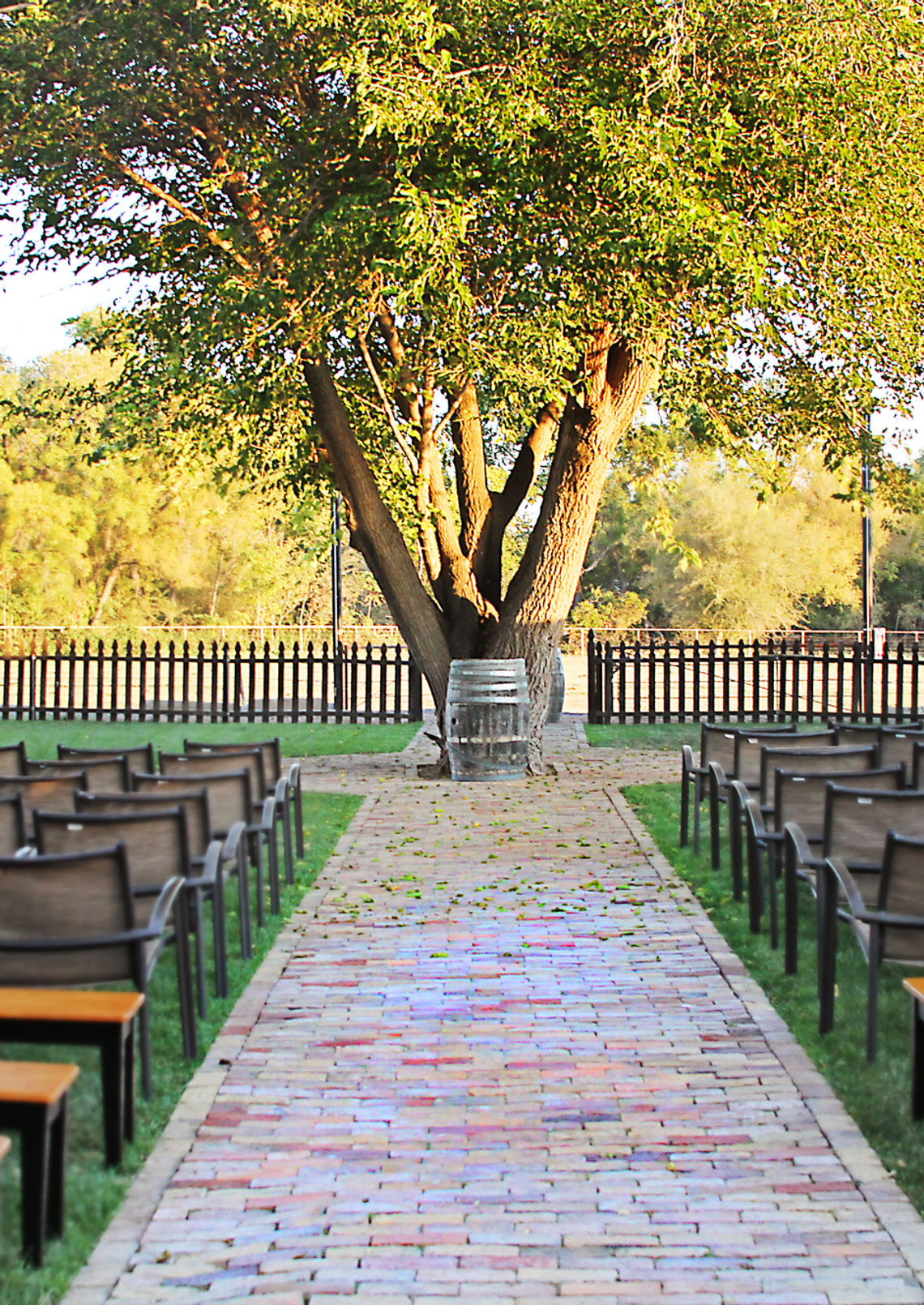 The impressive beauty of The Barn at UVX Rustic Ranch will allow your mind to imagine the perfect setting to enjoy your day. The soaring cathedral ceiling with chandeliers is the first thing you see and brings openness and light to any event. The rustic features of the barn include an old feeding trough which borders the long center isle of old pine floors. The large sliding glass barn doors open to extend your entertaining space out to the sprawling patio. The serenity of the garden chapel begins the moment you enter the doors and ends with the ceremony of joining two lives as one. The backdrop for this special ceremony is a symbolic branching tree. A simple rustic brick pathway leads to the tree joined together by a circle which leads away looking onto a pastoral setting. The beginnings of loves never ending story.