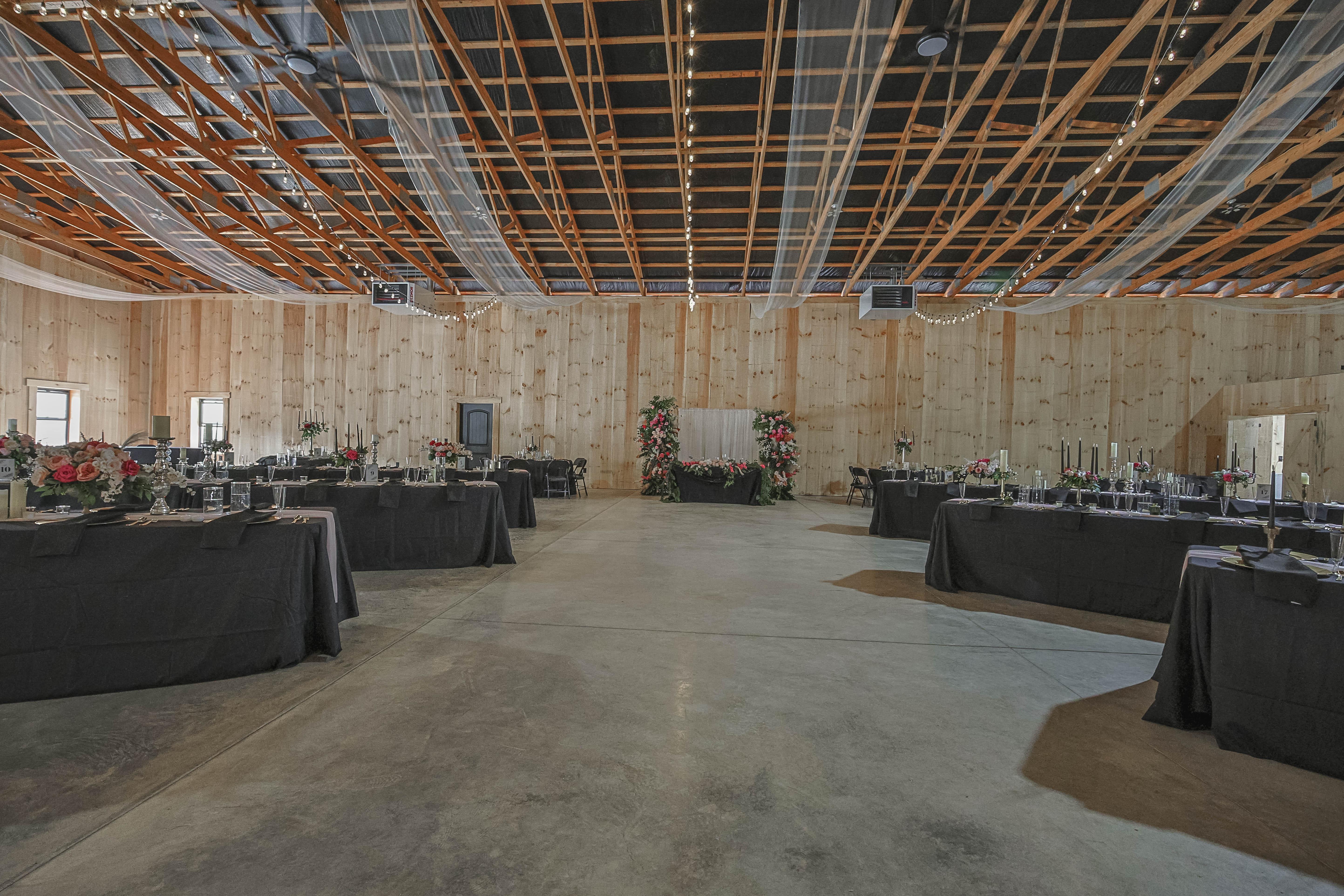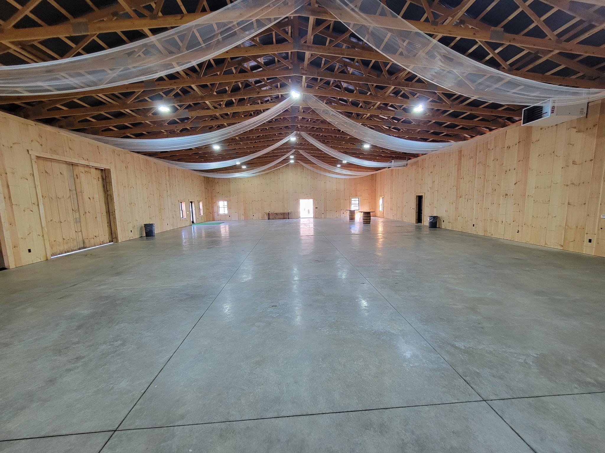 Our Venue is Family Owned and Operated. Located in Newark Ohio on 29 wooded acres and open field. We feature a stocked pond for fishing, a bridal and groom suite as well as a prep kitchen. The Barns main room is 5300 square feet and will seat 250-300 guests. The outdoor patio area is covered featuring a fire table and barrel tables. There are multiple ceremony locations and tables and chairs are included in your rental. You may bring your own food and drinks and alcohol is permitted with the purchase of event insurance.