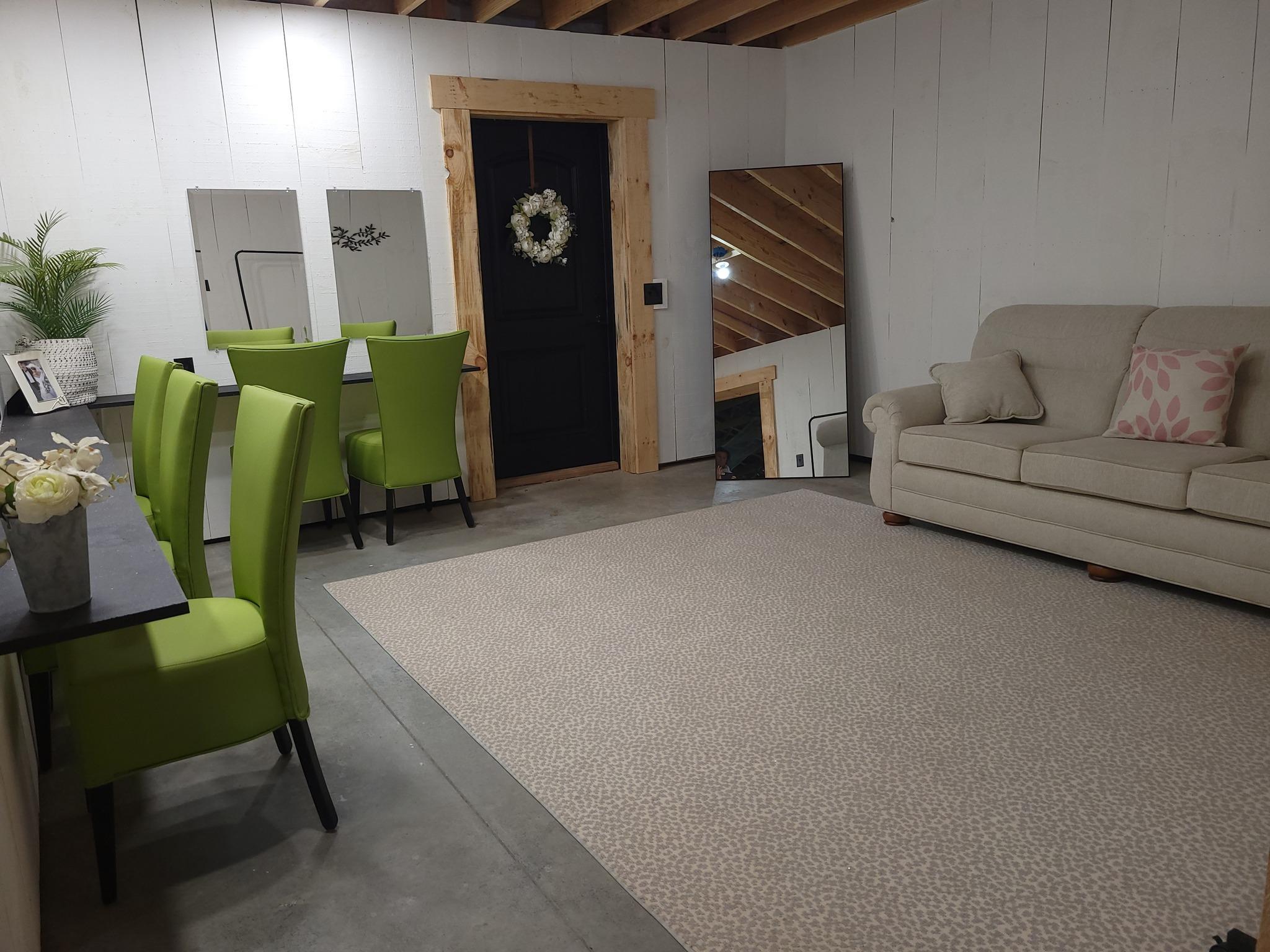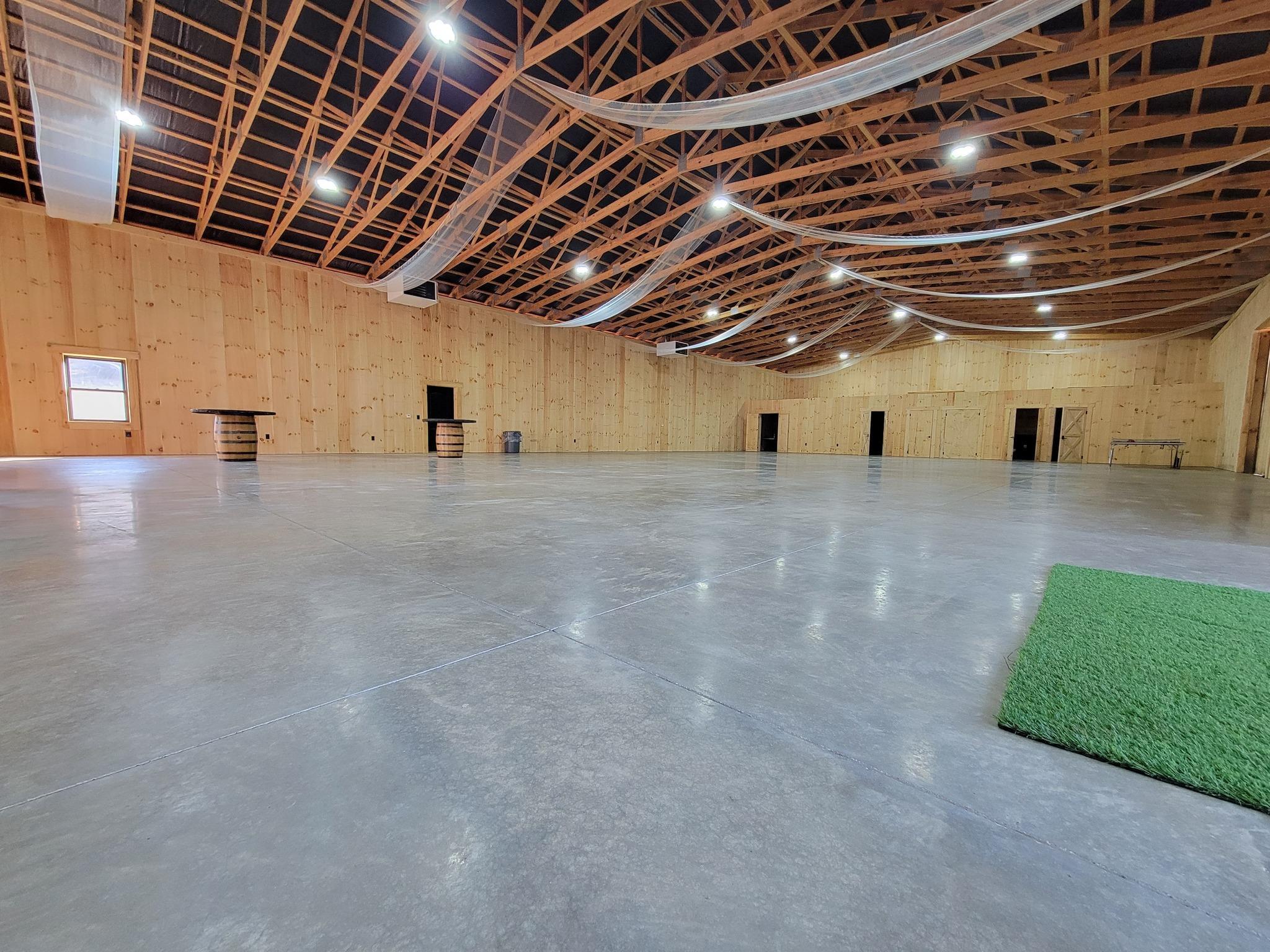 This space is 5300 square feet of open space. There are several lighting options available including string lights. Depending your table set up will depend on max capacity of 250 or 350. There are two large barn doors that can also be opened.
