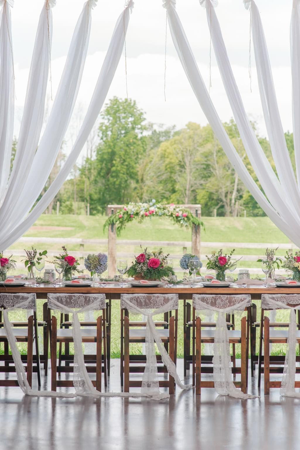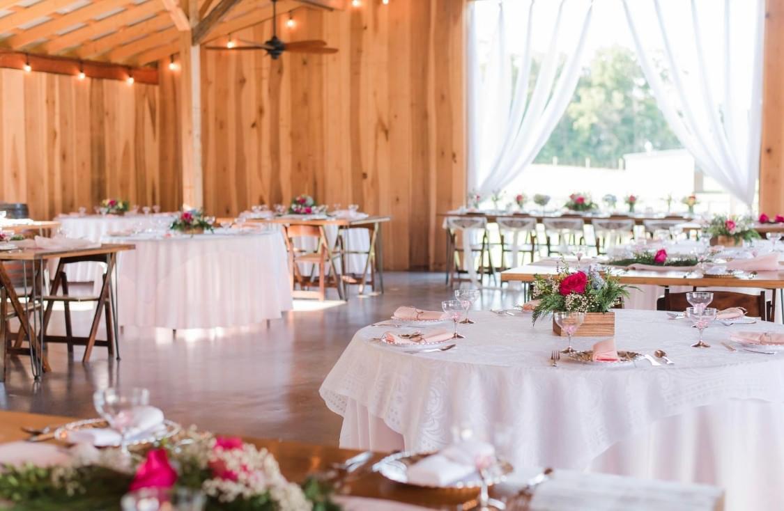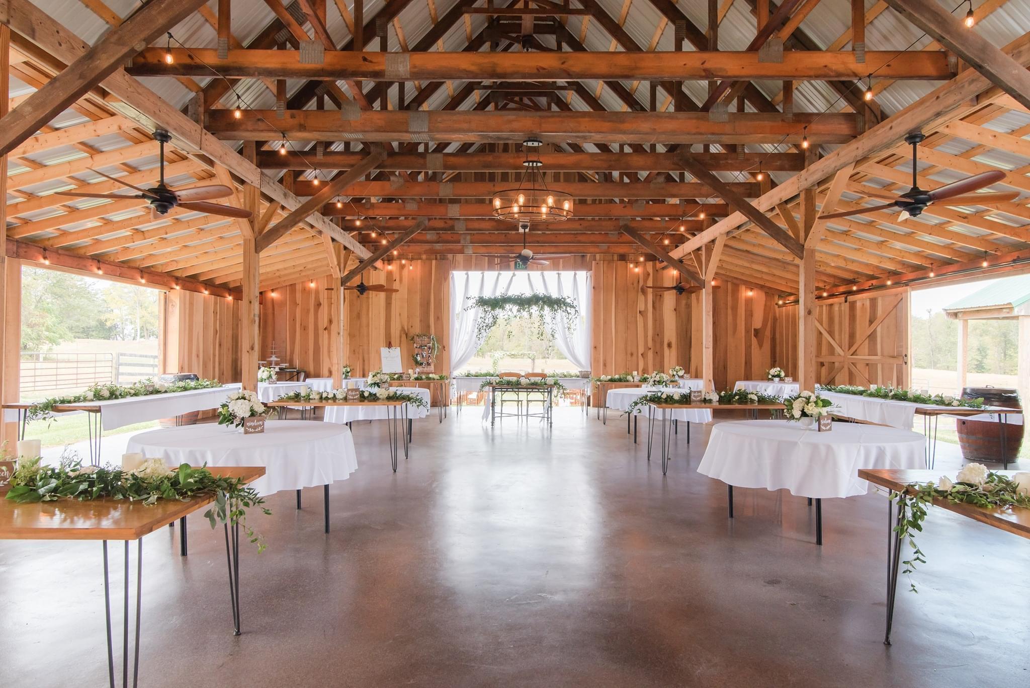 150 Fruitwood Wooden Chairs With Cream Seat 5 - 10' Custom Wooden Farm Tables (seats 10-12 people) 6 - 5' Custom Wooden Farm Tables (seats 4-6 people) 8 round tables 2- 7' Buffet Tables Sweetheart Table Bistro Lights in the Great Hall & Courtyard 18ft Flowing White Organza Decor Decorated Bar Area 5 - 12ft Sliding Wooden Barn Doors 26 Ceiling Fans For Air Circulation 2 Dressing Areas (Perfect for Bridal Parties) 4 Indoor Restrooms ADA Restroom 4 Wine Barrel Trash Cans Horses & Fields Surround