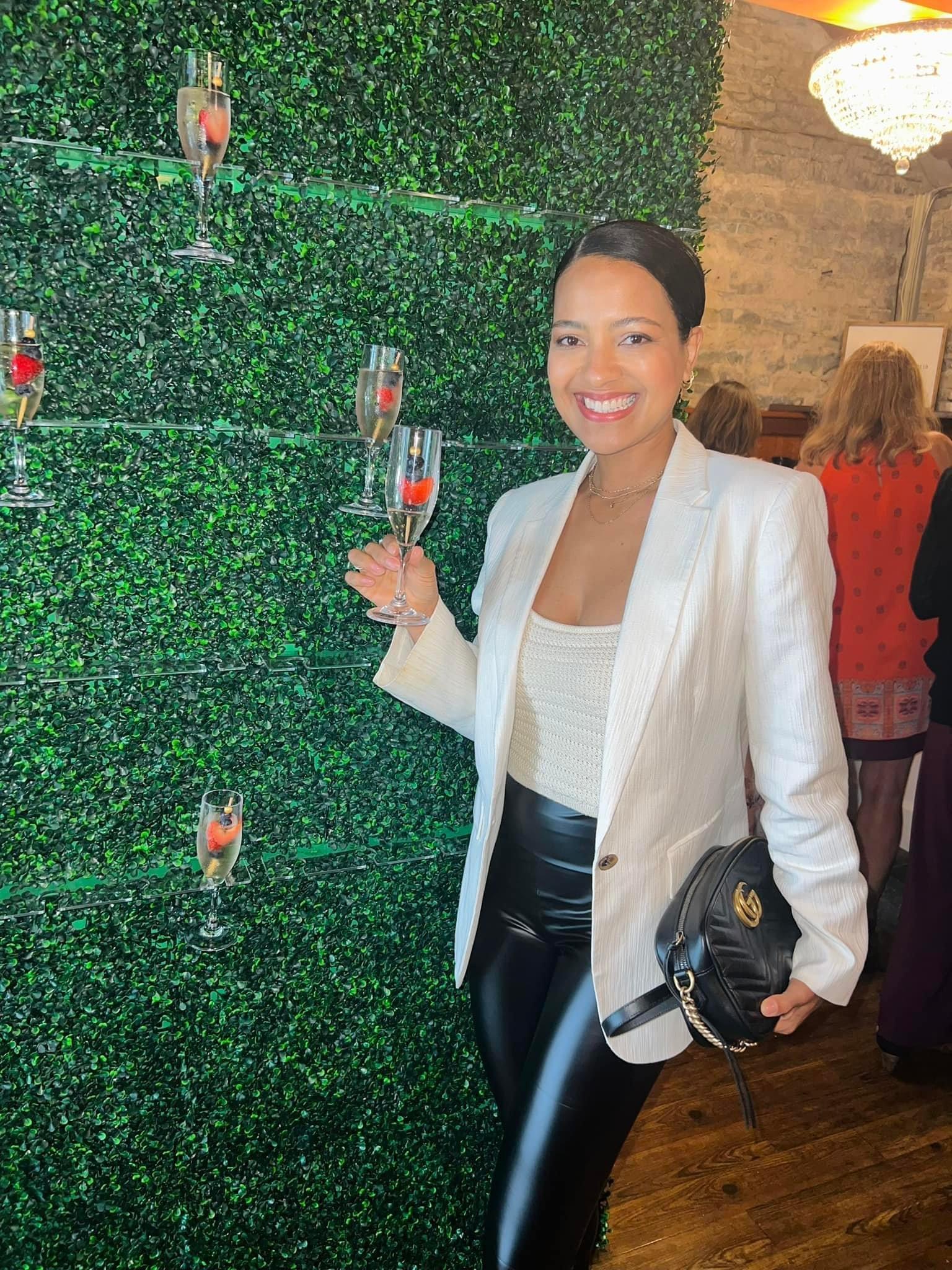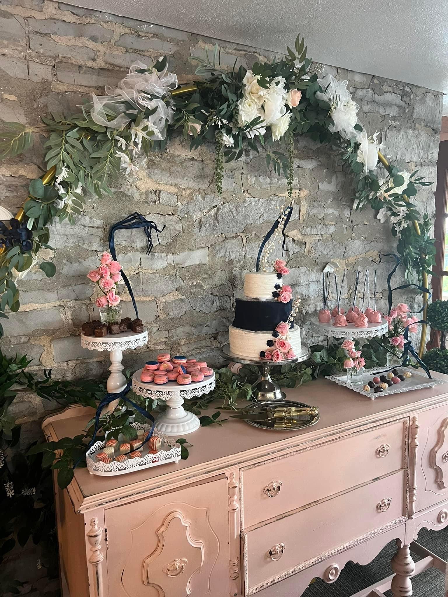 Includes 50 people, flowers, photography, music with introductions, three-tiered wedding cake and dessert table, tablescaping, four entrees of your choice, salad of your choice, three appetizers of your choice, all non-alcoholic beverages, open bar for five hours including all beer, wine and any mixed alcoholic beverage that can be made as long as it uses “well” alcohol, plus two signature drinks made with any alcohol of your liking, Champagne Wall or toast at table, cake, favors, tax & tip,