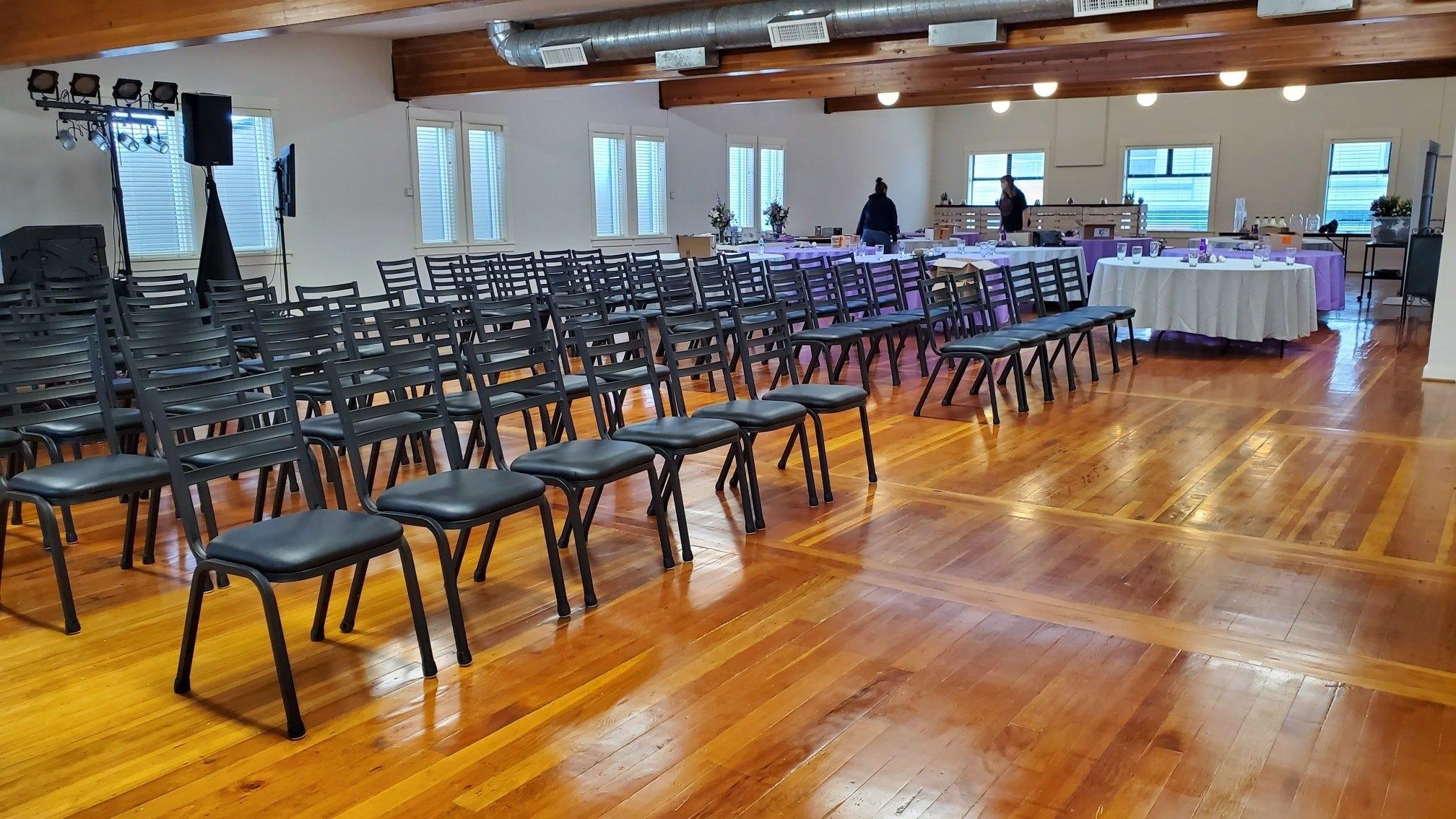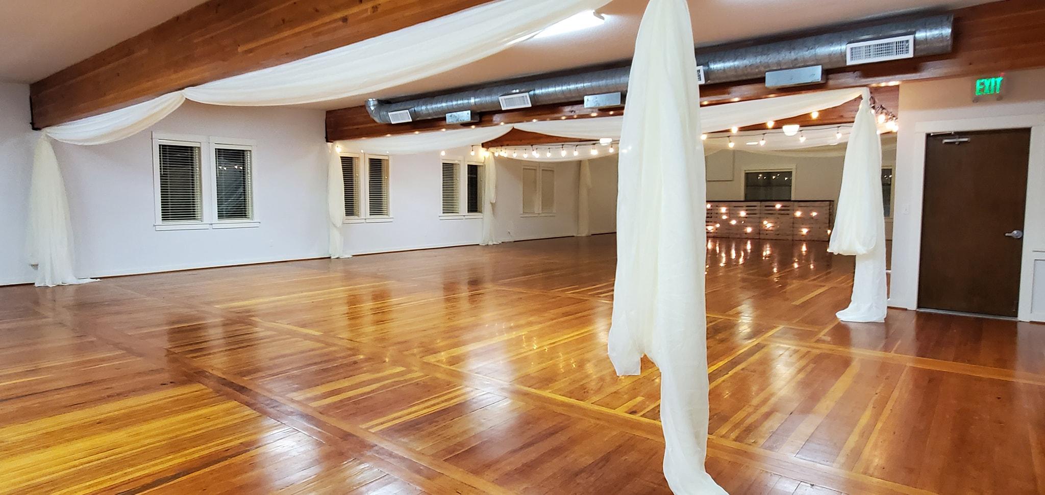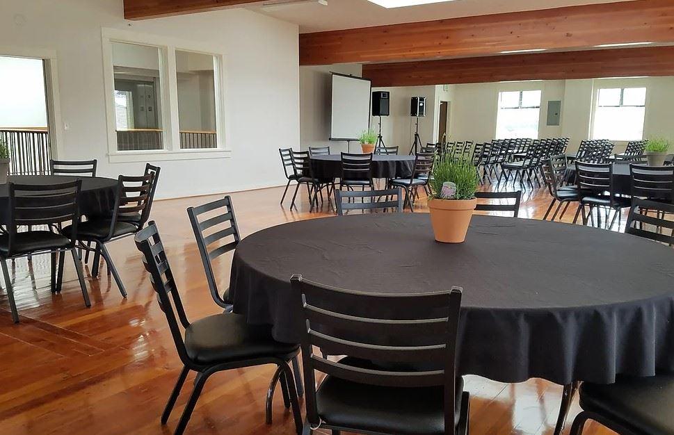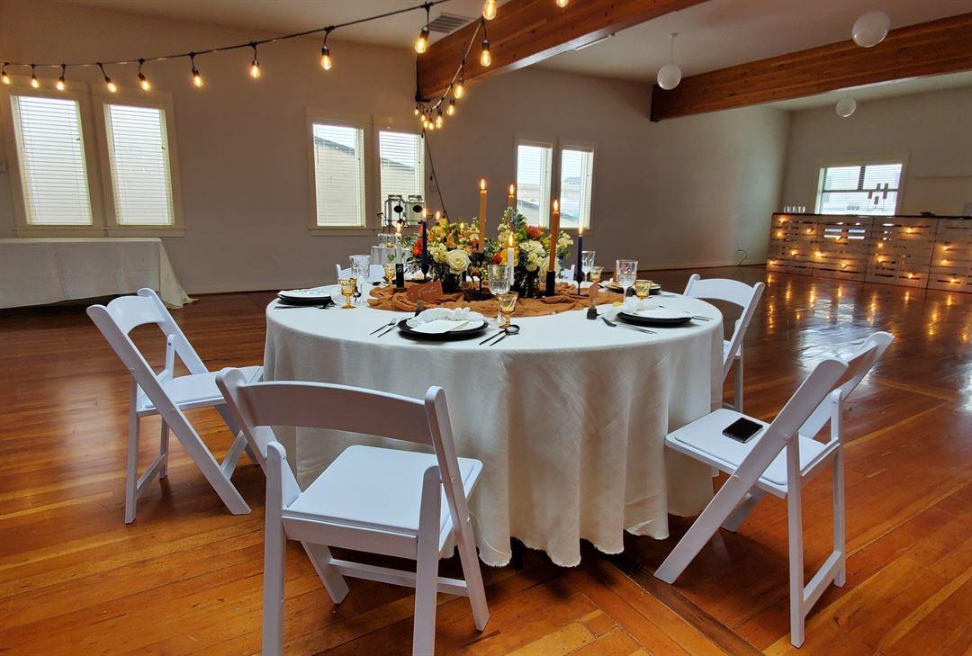 This beautiful space is well suited for private rentals. It is elegant for a wedding and reception holding up to 150 seated guests. As shown in the photos, this room has stunning hardwood flooring and gorgeous lights. When you rent this space you get: 10 - 6 ft round tables, 10 - 5 ft round tables, 2 - 8 ft banquet tables, 150 chairs.