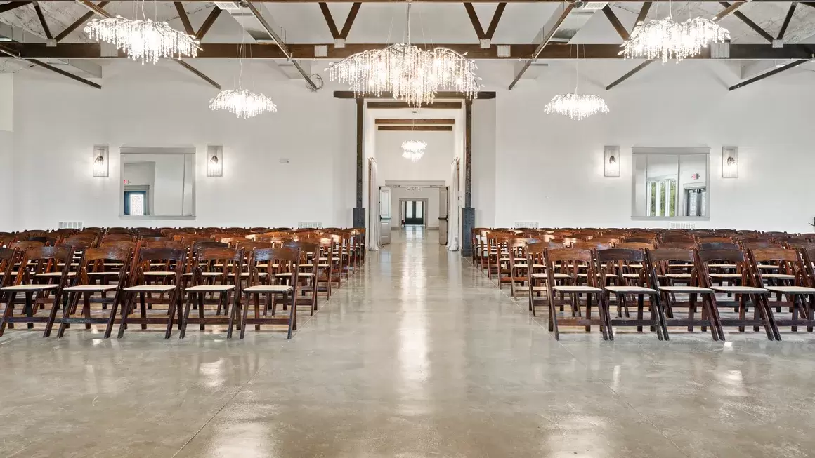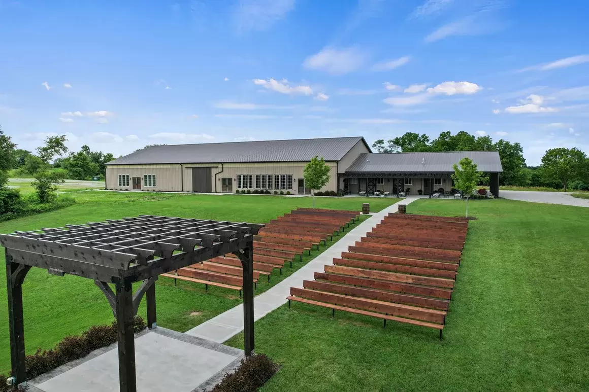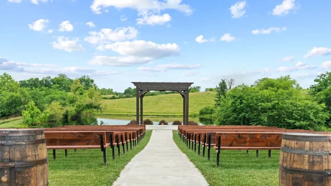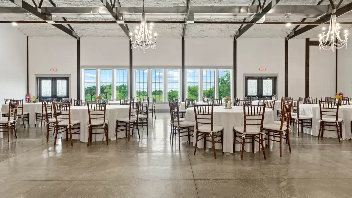 • Outdoor Ceremony: Panoramic country views, secluded on 60 acres, accented with lights at night. • Indoor option: beautiful chapel with stone wall. • Grand Hallway: Glass and iron double doors, iron and crystal chandeliers, repurposed barn planked wood walls, horse stall doors with antiqued mirrors. • Reception Hall: Spacious, climate controlled, 4500 square feet, 9 stunning chandeliers, glass and iron double doors to patio, warming kitchen with commercial refrigerators, large granite bar with unique lighting, 300 chairs, tables, banquet tables, cocktail tables, portable bars, propane heaters, whiskey barrels. • Bridal and Groom's Rooms: Adjacent to reception hall, private bathrooms, makeup stations, barn wood wall, patio. • Honeymoon Suite: 4000 square foot lodge, sleeps 16, indoor endless pool, king bed, full-size beds, single beds, stocked with small appliances.