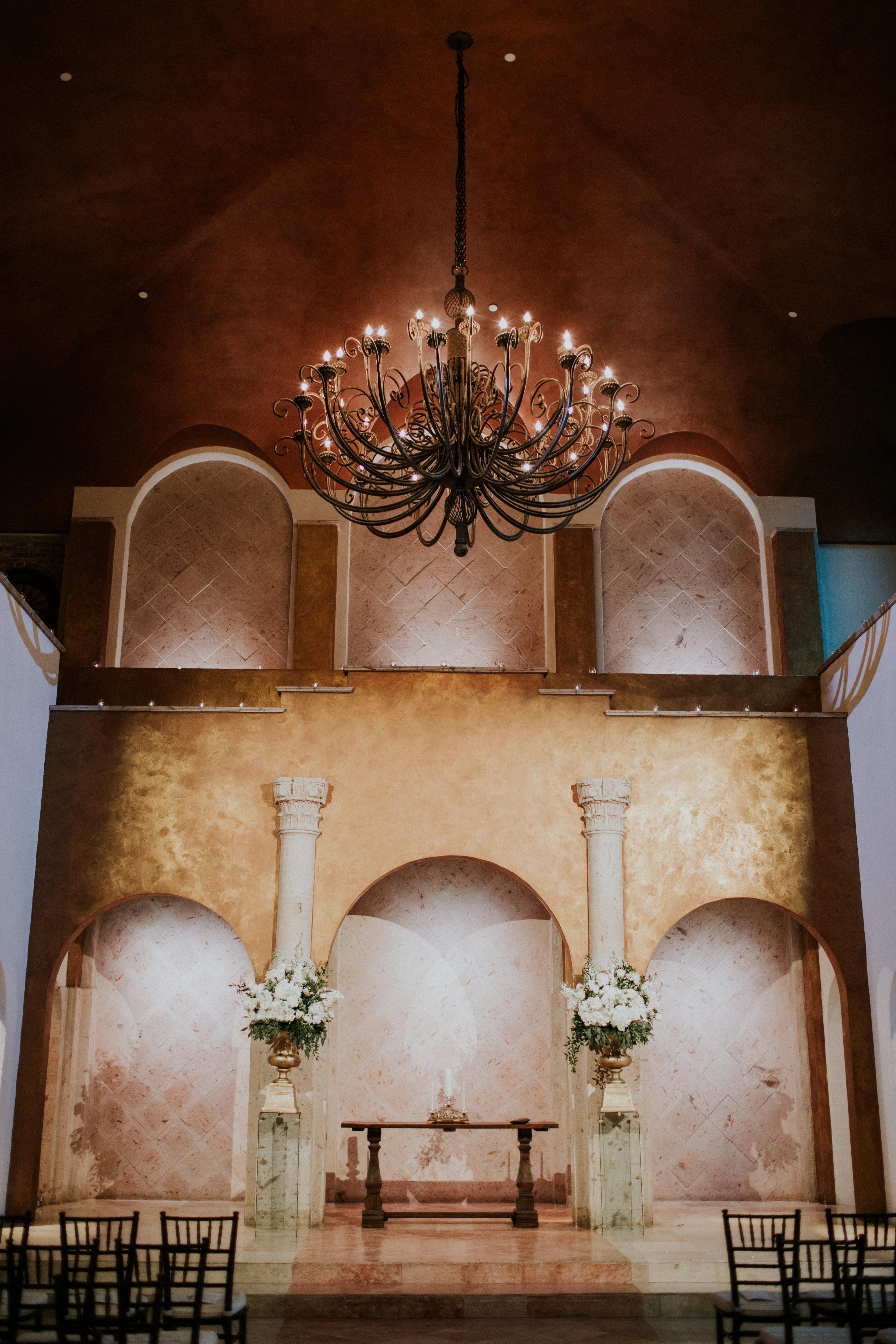 Beautiful Ceremony and Reception Space featuring a grand staircase, trio of chandeliers, domed altar and high ceilings.