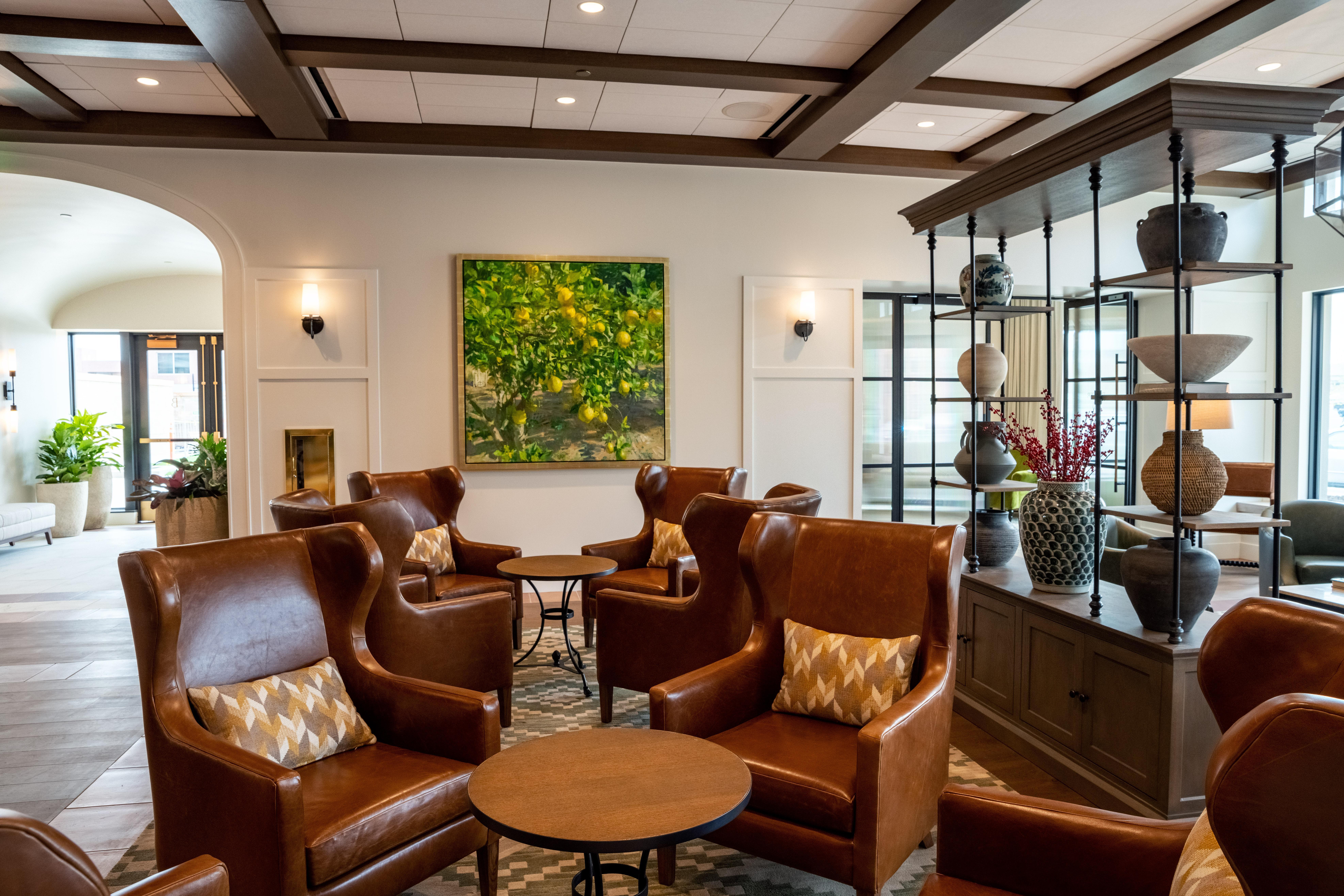 The Living Room: A Sophisticated, Cozy Event Space with Warm Leather Seating, Elegant Décor, and Inviting Natural Light.