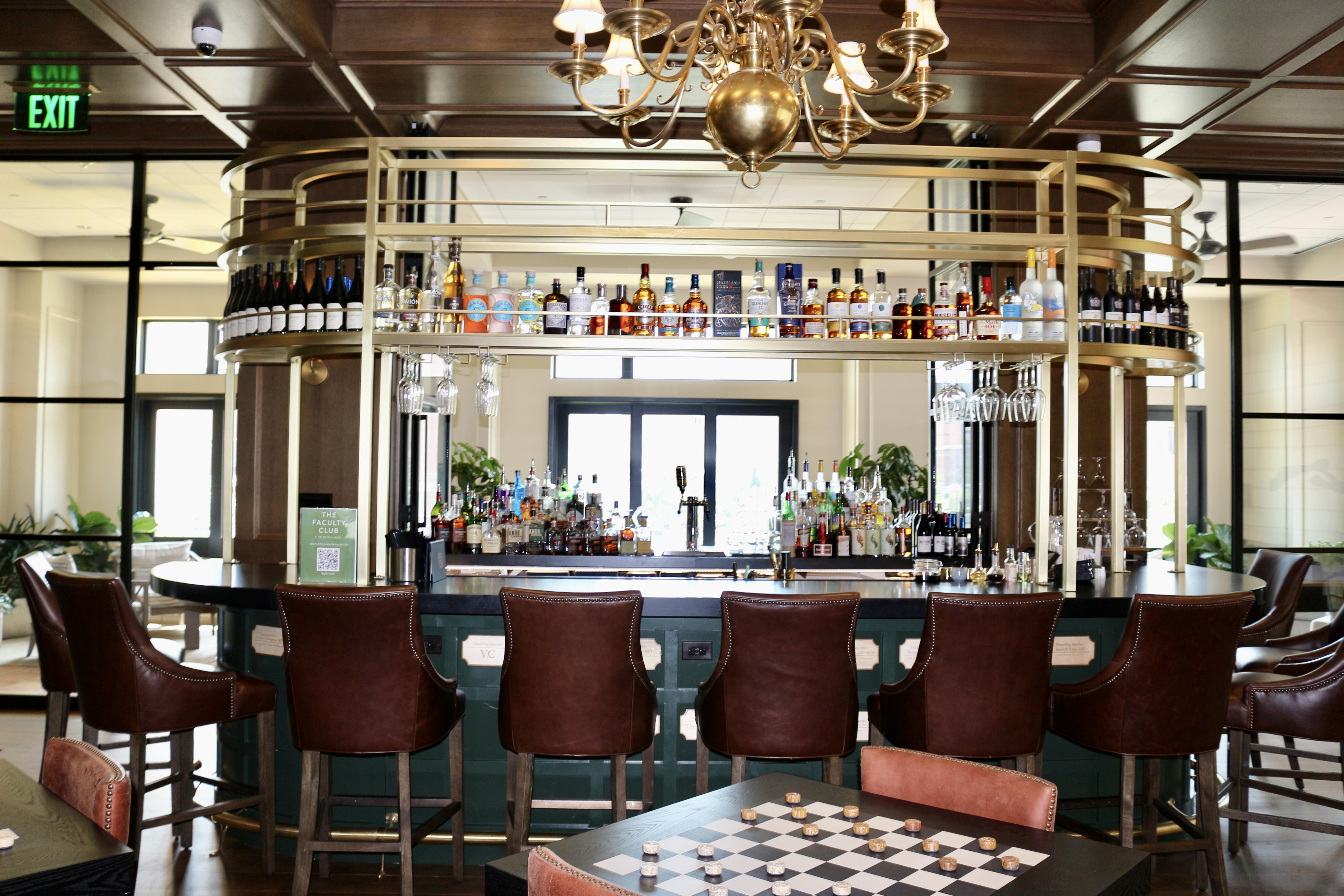 The Faculty Club exudes classic elegance with dark wood paneling, a coffered ceiling, and warm ambient lighting. A green, gold-framed bar serves as the centerpiece, surrounded by leather bar stools and plush seating, including tufted armchairs and modern chairs. A Persian-style rug adds warmth, while a black fireplace with a vibrant landscape painting enhances the cozy, sophisticated vibe. Large windows, velvet drapes, and potted plants complete the inviting, refined atmosphere.