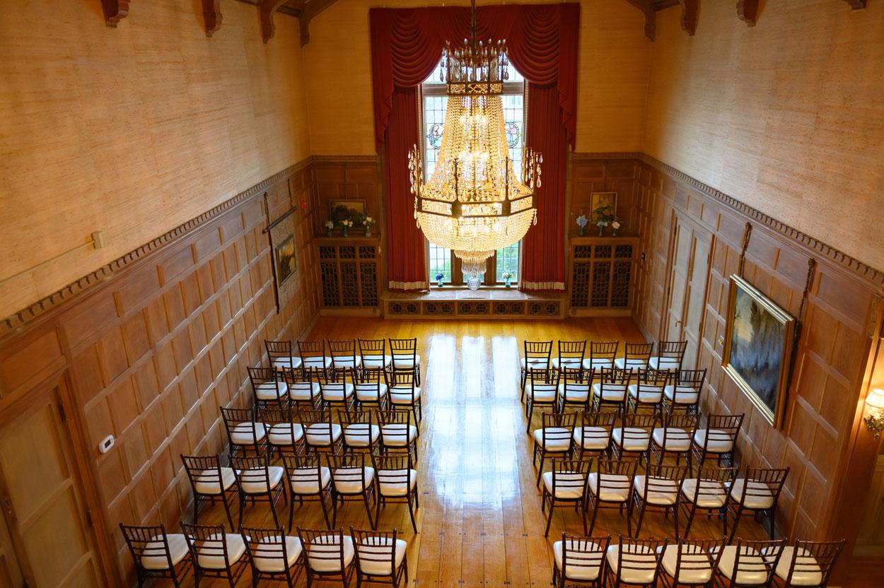 This space immediately transports guests into the ballroom of a millionaire in the early 1900's. This room requires no additional décor, as guests are already left in awe by the space's natural beauty, architecture and chandelier. This room is wonderful for intimate indoor ceremonies for guest counts of 100 or less, or an intimate dinner space for groups of 70 or less. Otherwise, it is frequently used for cocktail hour, buffets, or dancing.