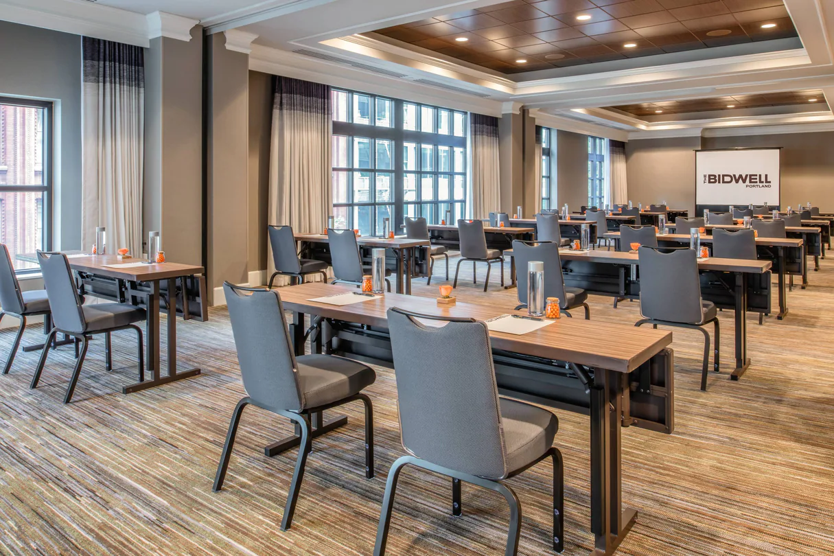 The Bidwell is a luxury hotel in downtown Portland offering guests easy access to the city’s tax-free shopping, dining, and top attractions including Powell's Bookstore, Multnomah Falls, and Pearl District. Foodies can tour the 100s of restaurants and bars right around the corner along with parks and outdoor spaces. Try our hip High Horse restaurant and bar featuring views of Portland’s Theater district and an elevated selection of regionally inspired food and drinks or unwind at our spacious M Club lounge. Each spacious room offers a stunning view of the city, mountains or beautiful West Hills and features state-of-the-art amenities including a 65-inch HDTV and complimentary Wi-Fi. Hotel amenities include refillable water stations on every floor, a fitness center with Peloton bikes and TRX equipment.