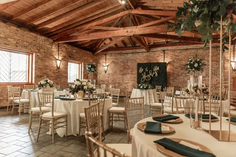 The 10,000 sqft indoor venue is able to comfortably accommodate more than 200 guests for a seated dinner or 300 guest for a cocktail style reception. This space allows for ample room for a dance floor, buffet and flexibility on the layout of your event . The interior space is finished with original handmade brick, arched doorways, and heart pine beams. The iron wall sconces and added details allow the space to work for both classically styled and urban chic events.