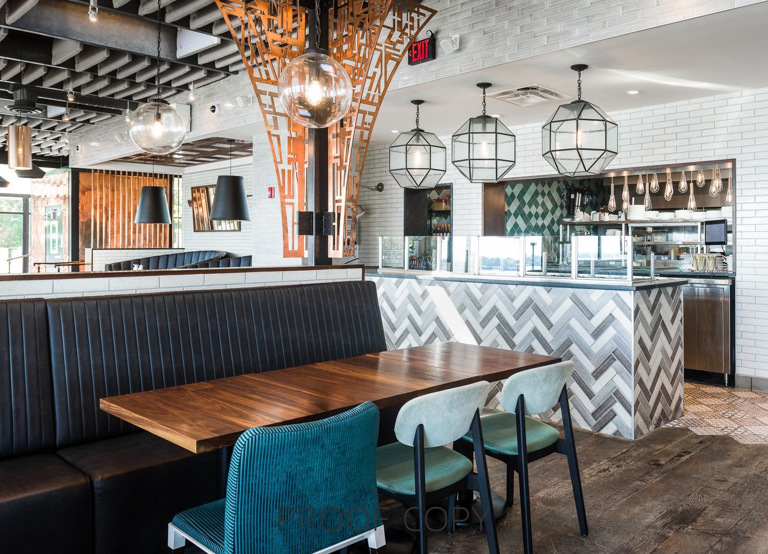 A private dining room inside the restaurant, The Navigator’s Den offers wood-grain tables and an unparalleled riverfront view. A drop-down screen and built-in projector with AV connections are also available.