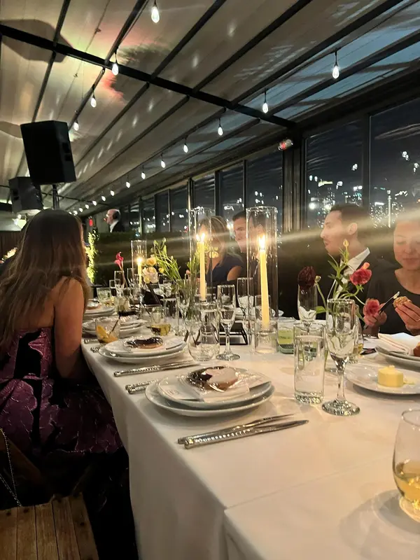 We include setup & breakdown, retractable roof, security, glass sliding windows, tables, A/C and heating, chairs, flatware, glassware, white linens, intimate string lighting, shrubbery, coat check, votive candles, vintage checker cabs, and menu printing.