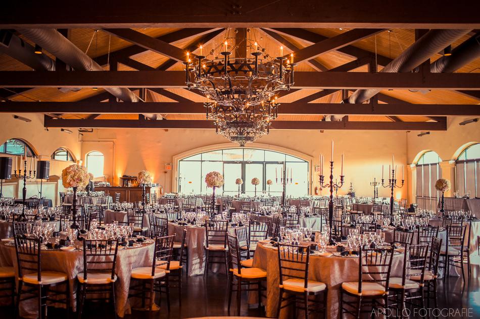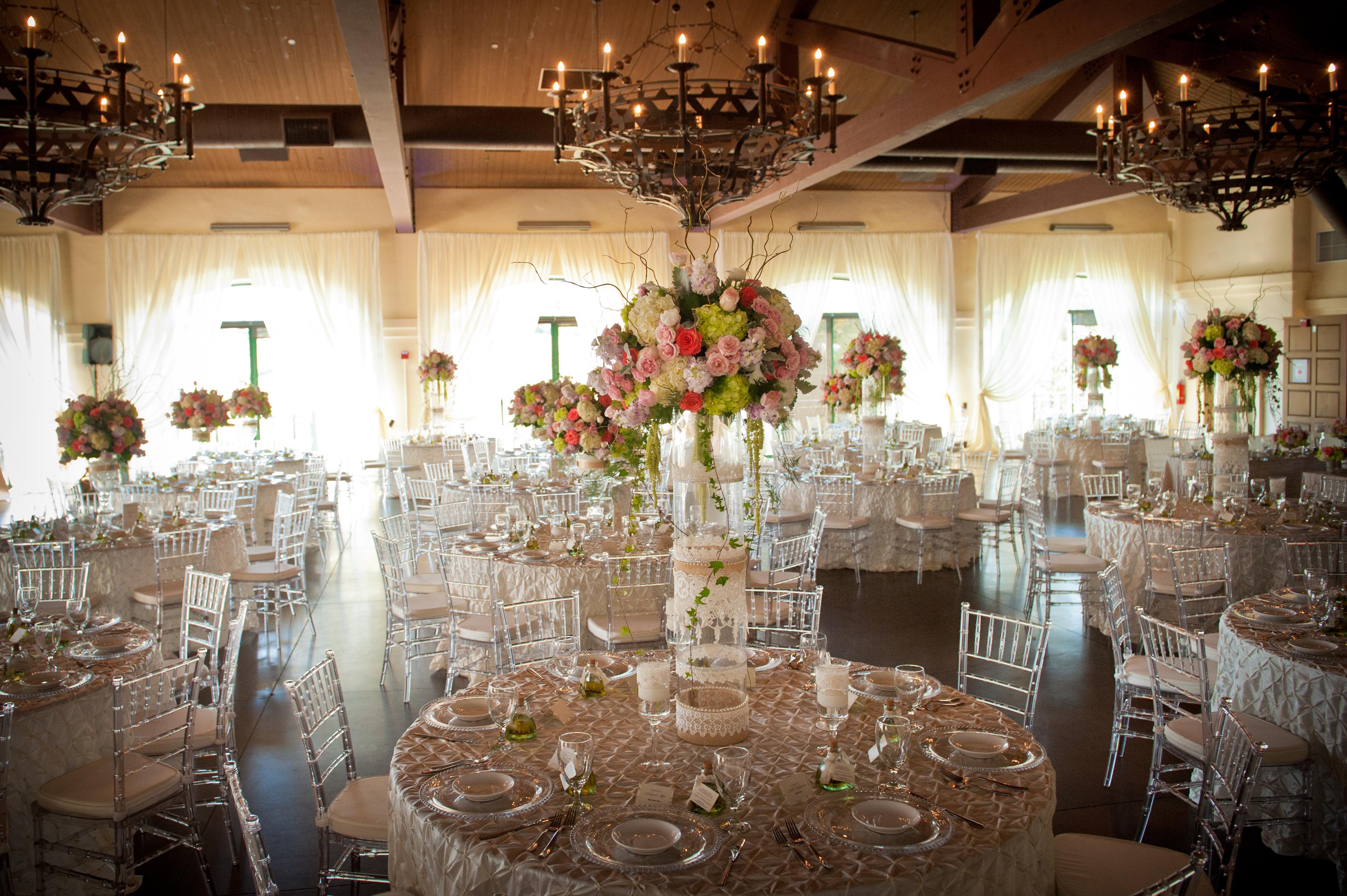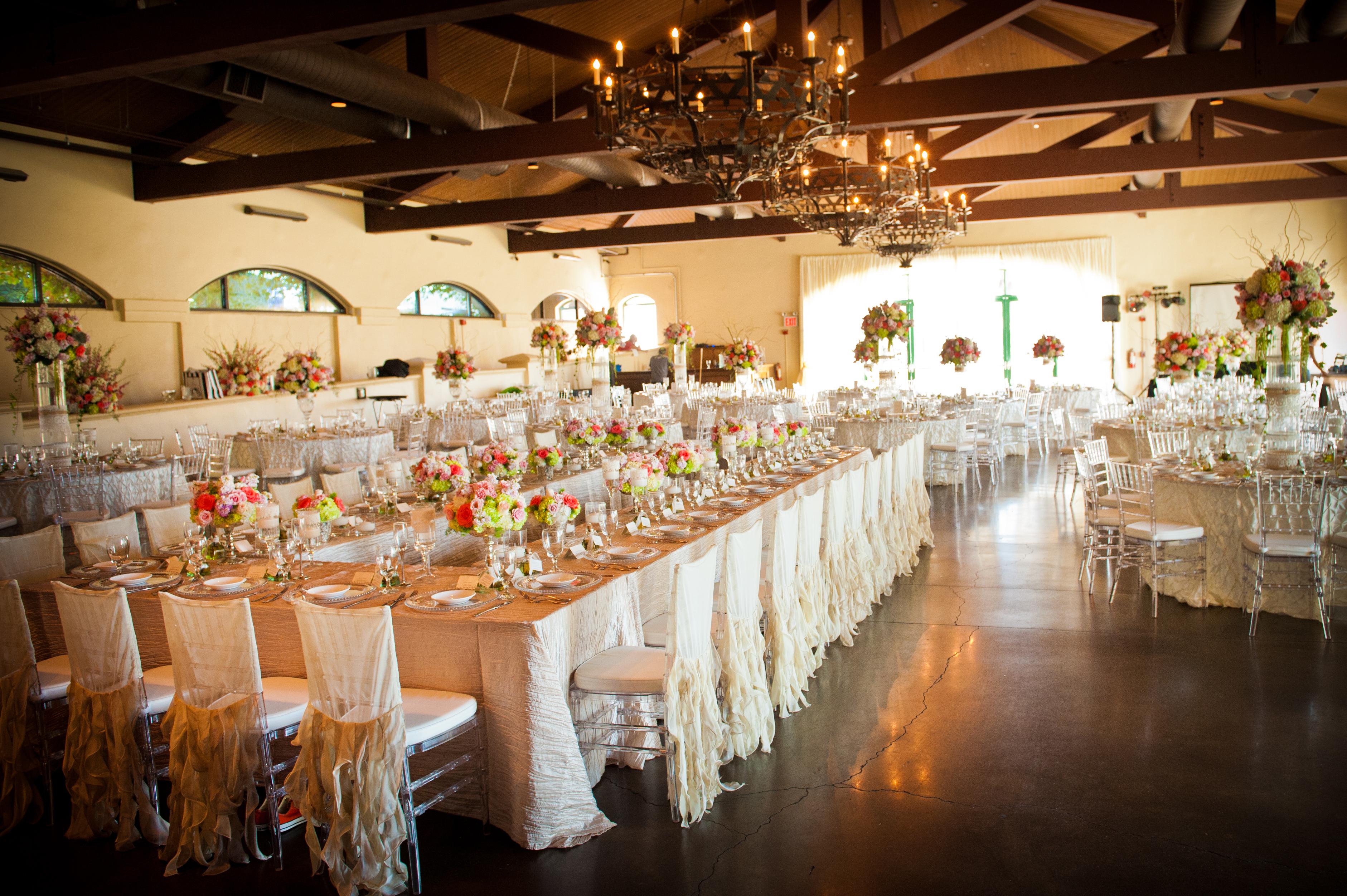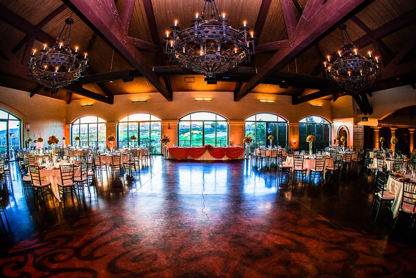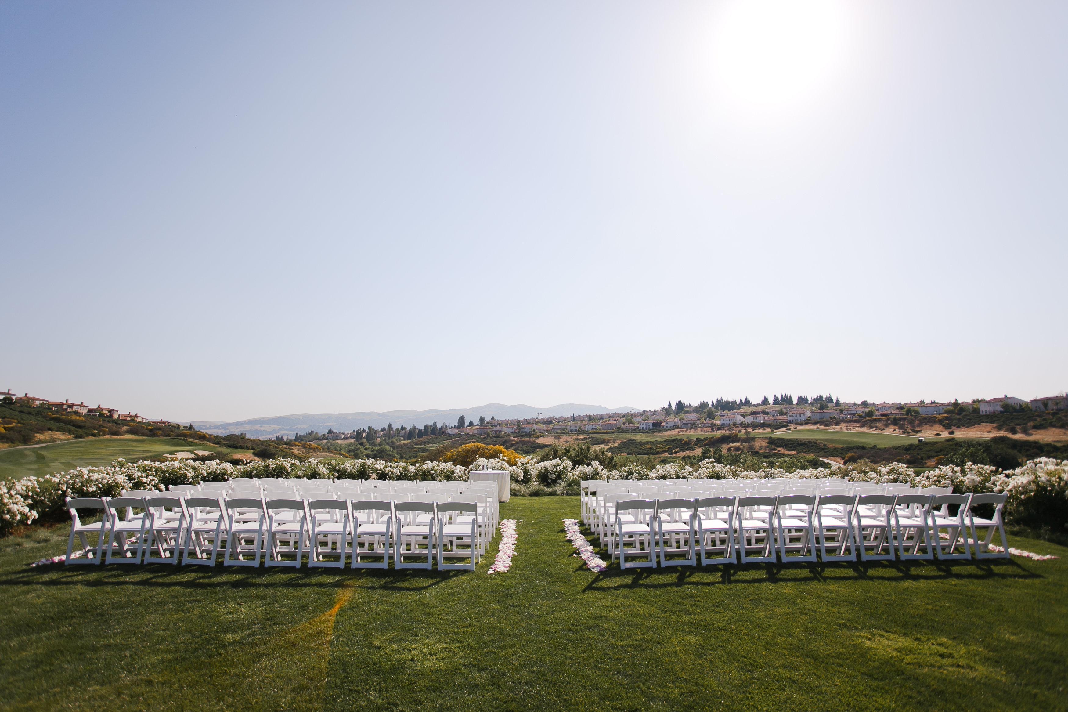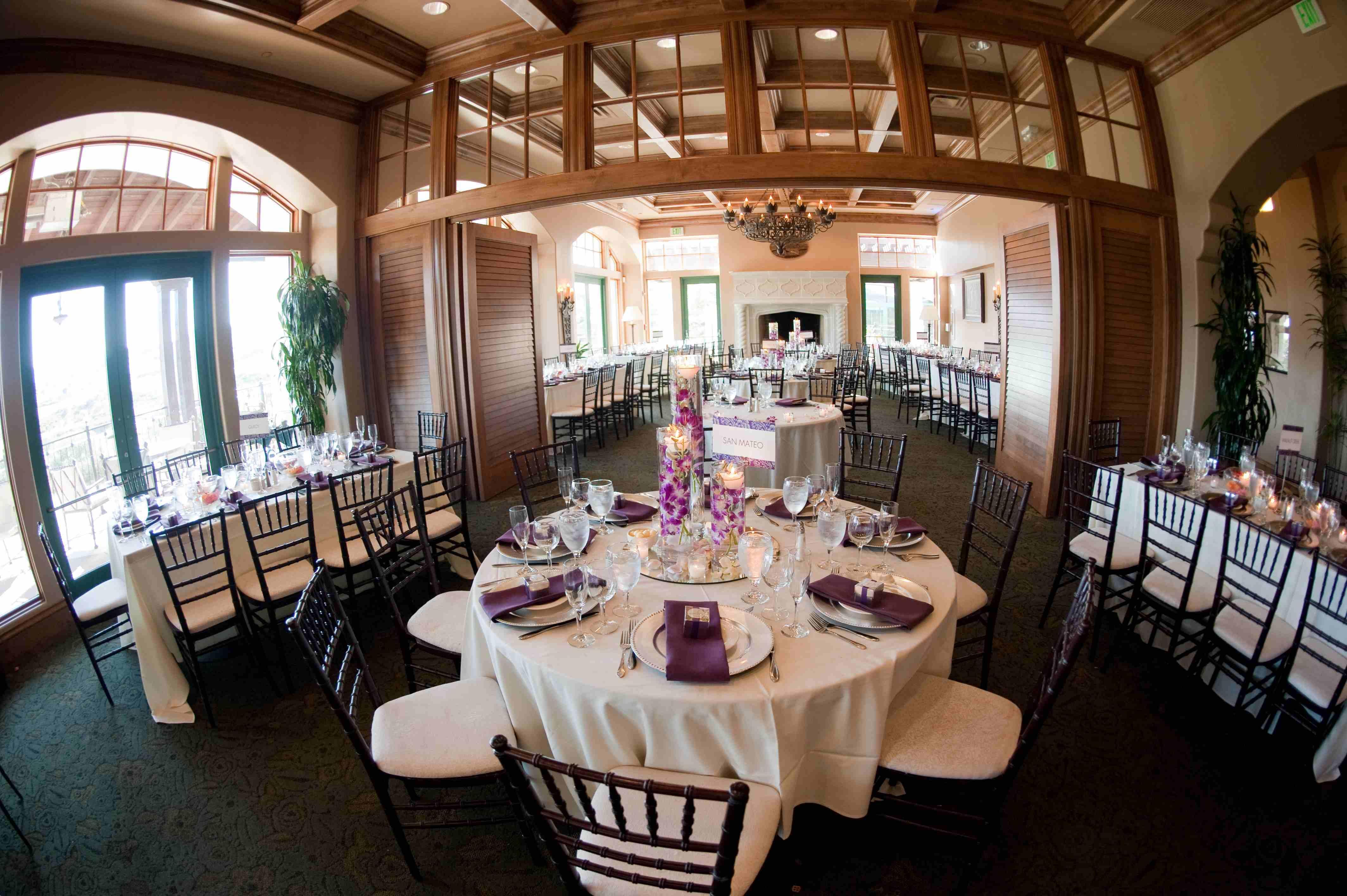 The Bridges Golf Club is an elegant and sophisticated wedding venue located in San Ramon, California. Overlooking the beautiful rolling hills and valley of San Ramon, this Mediterranean-style structure features spectacular and dramatic views of the setting sun over the East Bay Hills, a welcoming atmosphere and superior service. Whether your wedding is as intimate as 25 guests or as large as 300 guests, The Bridges Golf Club brings to life magnificent wedding receptions and special occasions. Wedding ceremonies begin outside the clubhouse on a grass terrace perched on a gentle rise, overlooking fairways below. The clubhouse exterior features a tiled roof, white walls and Moorish turrets, and the interior features soothing earth tones, elegant chandeliers and refined décor to create the perfect celebratory ambience.