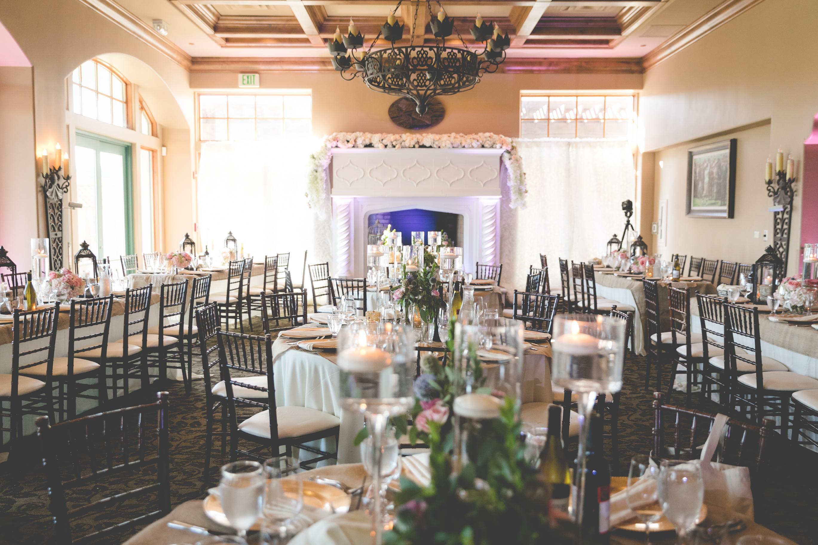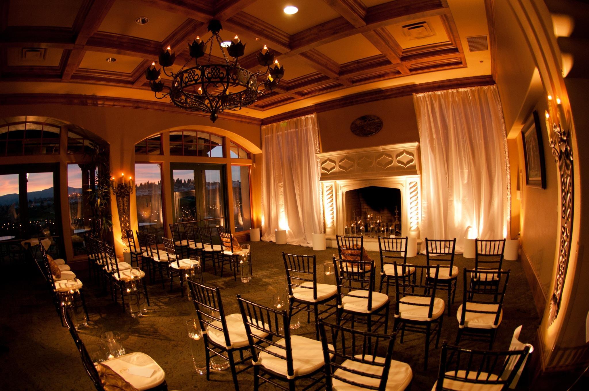 When you enter the clubhouse lobby, a pair of elaborate wrought-iron gates to your left opens into a swanky bar inside one of those exotic towers you noticed out front. The bar adjoins the Golfer’s Patio, where guests can quaff cocktails under the shade of a sycamore. Wall sconces and an antique-style chandelier produce a romantic candelabra effect. Hold your ceremony in front of the Fireplace for a warm, winter wedding.