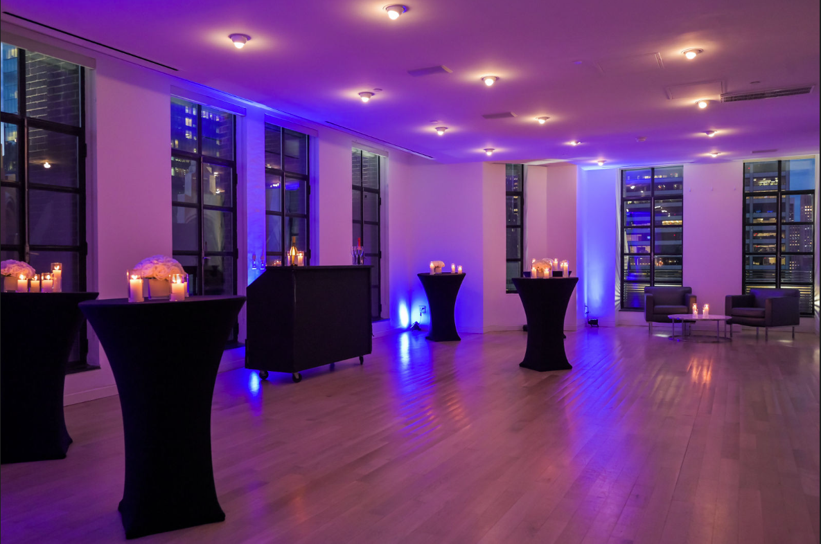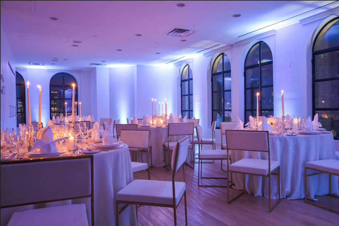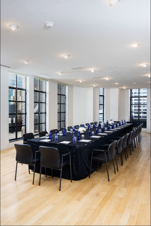 The Terrace Loft includes, 6ft rectangular dinner tables, black leather chairs, high top tables, portable bar, wireless microphone, in-house Bluetooth speaker, central HVAC, two (2) bathrooms, closet space, dimmable lighting and amazing views. Additional furniture is available via private rental.
