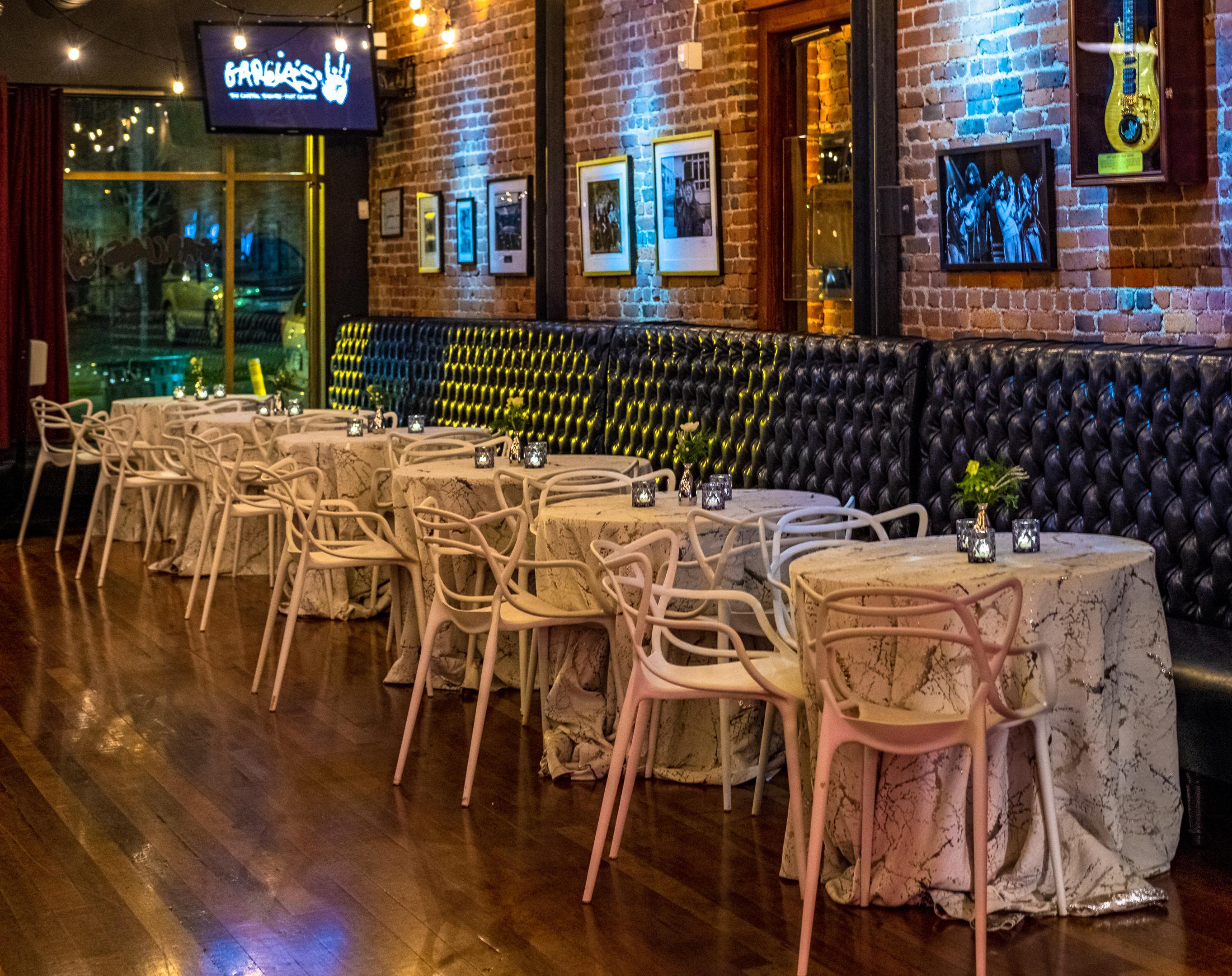 Garcia's, a spacious lobby bar and event space of its own, is complete with its own stage. Surrounding the black leather banquettes are exposed brick walls highlighted by instruments and rare rock memorabilia.