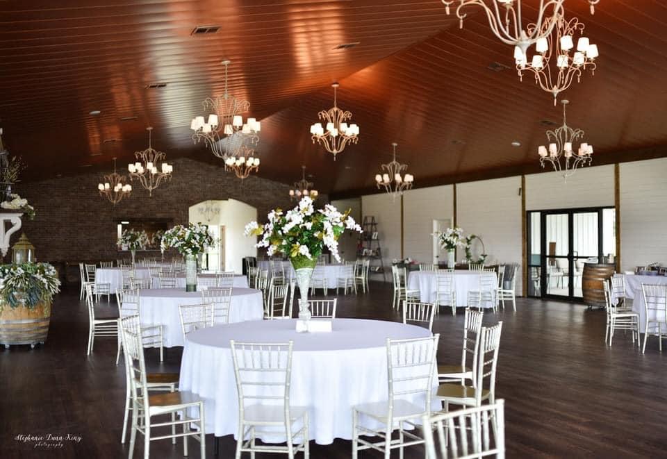 The Carriage House at Big Oak Hill Ranch provides 8,000 square feet of event and wedding space nestled on a 300 acre farm in South Arkansas. The Carriage House embodies southern New Orleans charm with French chandeliers, antique brick arches, and shiplap and exposed beams highlighted by a beautiful copper ceiling.
