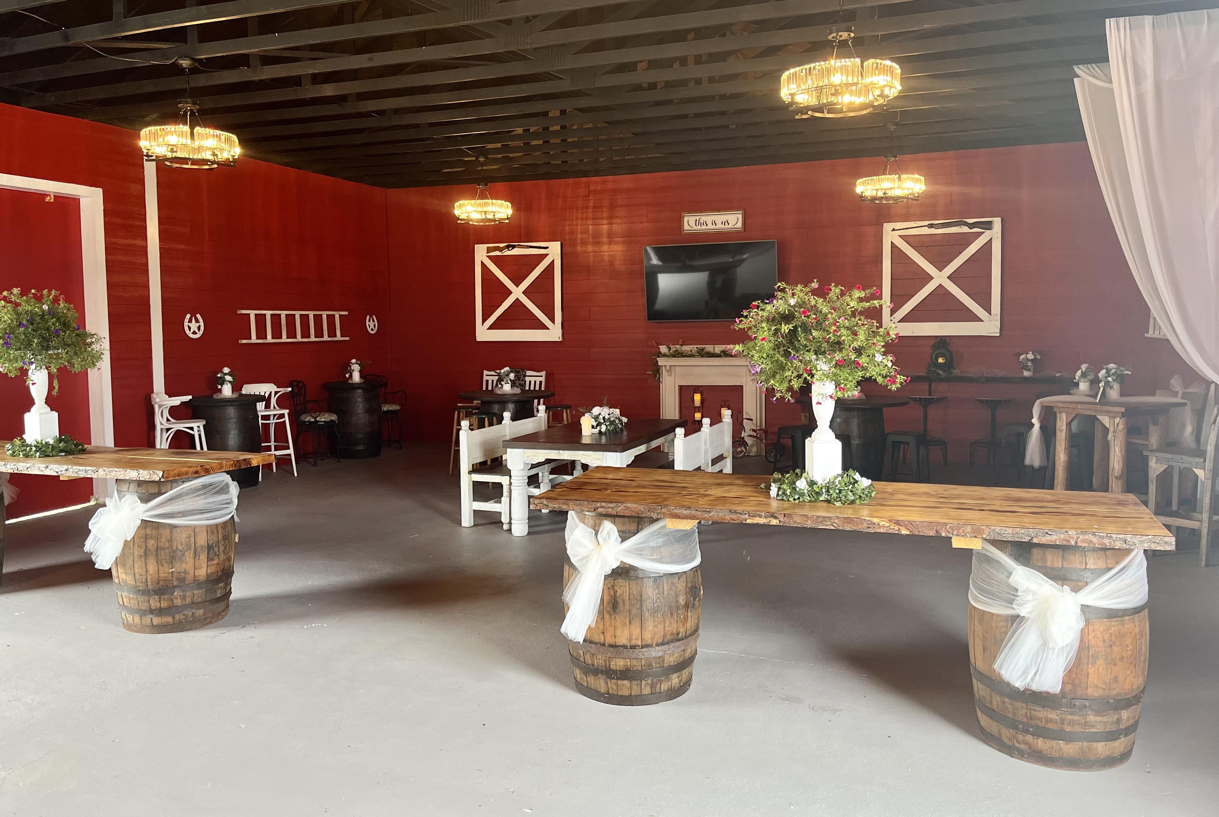The Carriage House is a climate controlled 2250 square foot Carriage House opens from both sides with sliding carriage/barn doors, into the Carriage Room which has a beautiful cherry wood floor, fireplace mantel with lighting, Chandeliers and red carpet runner leading through to the Deck and the Amish Wedding Gazebo. The Carriage Room also offers a vendor kitchen where food can be assembled, heated and plated for your event. The Carriage Room is inviting and welcoming. It is fully furnished with a western flare but also looks spectacular when it is dressed up with our beautiful linen and fine bone china. From Ranch House shabby chic to elegant, the choice of the motif is yours. The amenities at the Carriage House are unparalleled. The Carriage Room/Event Center looks spectacular for any event you desire. Amenities * Beer Garden *Bridal and Grooms Suites *Petting Zoo *Game Room *Dukes Tavern *Outdoor Games *Picturesque Views *Carriage Rides into the Sunset and much more.