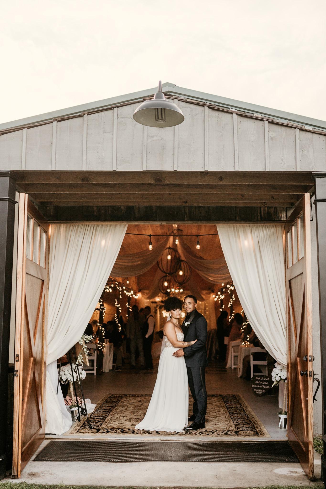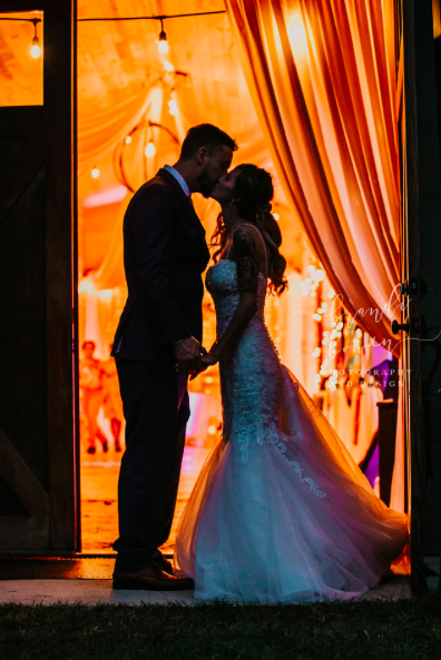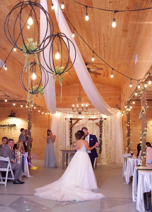 Our little striped barn is cute on the outside but elegant and soft on the inside. Tall wood ceilings, draping, chandeliers, and sparkly lights will transport you and your guests away from chaos of the world and into your fairy tale wedding.