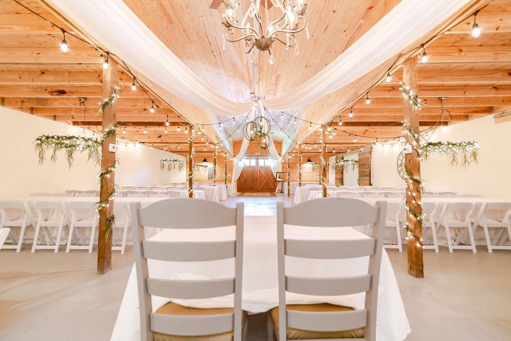 Tables and Chairs (150). Six lighted hanging greenery hoops or 6 hanging large white drum shades. Tall wood arch. Beautiful large X-barn doors draped with ivory sheers. CATERERS ROOM with 4 serving tables, refrigerator/freezer, large sink...no ice machine. Side entrance. BRIDES ROOM with sofa, outlets, large mirror, and hooks for dresses. Decor closets. Separate Entrance to stay hidden until the big moment! Two RESTROOMS, one with handicap bar.