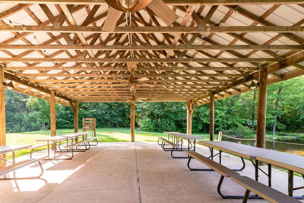 PAVILION--Patio Lights and 6 post lights, 2 electrical outlets, and 8 picnic tables. CABANAS--Hammock, 2 hanging chairs, 2 Adirondack chairs...Groomsmen hangout space. Three electrical outlets. GAZEBO--on the Island with patio lights in the top and electrical outlet. Connected by our gorgeous JAPANESE FOOTBRIDGE! Two-acre POND with big mouth bass. If you book with us, Yes, you may fish...catch & release.