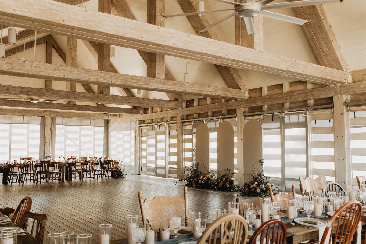20 6 foot (72") round tables; 150 black folding chairs; 6 8 foot (96") rectangular tables; 7 bistro tables; 28 bistro chairs; Caterer's prep kitchen, restrooms and a green room, all with built in AC and heat; The great hall is not air-conditioned but makes use of natural air-flow and "Big Ass" fans; Wooden dance floor; 3 sets of ceiling lighting, all of which are dimmable with a special colored lighting feature; Retractable clear wall and door panels to allow for more internal climate control.
