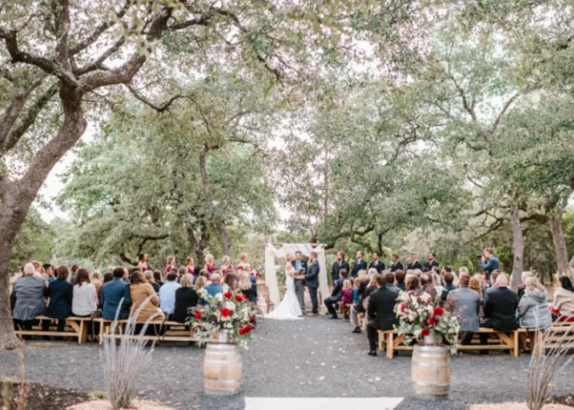 Our great hall has been designed to allow you and your guests feel immersed in the surrounding beauty of the Texas Hill Country while being indoors. Our hall offers the best of both worlds- providing a covering with great lighting and is open-air allowing for fresh air circulation (which is important during this pandemic). Our hall has reception seating capacity for 200 guests, with our generous rental package including reception tables and chairs to seat 150, plus more!