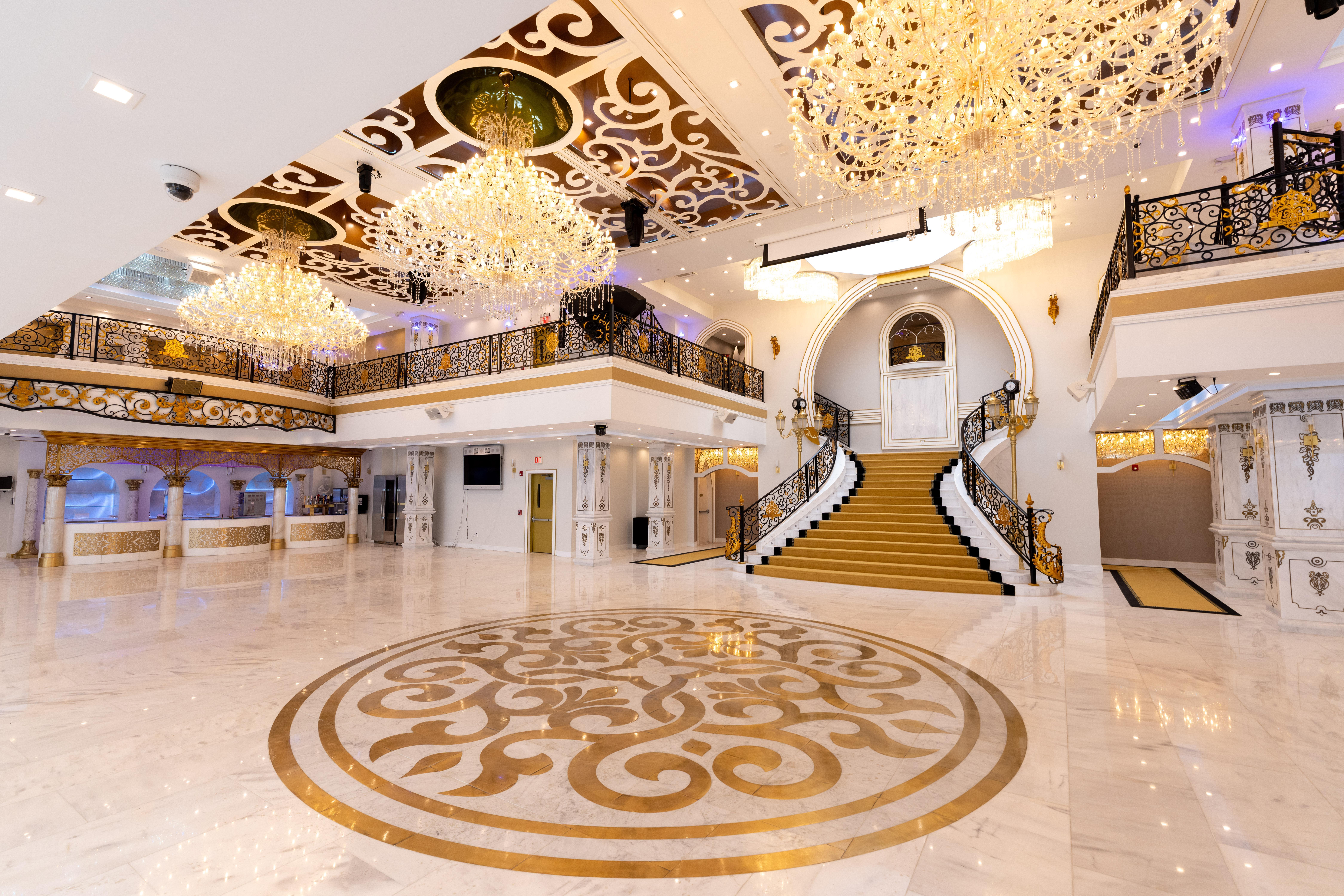- Dimmers for lighting customization - High gloss marble floors - TV/Screens mounted on walls - Bar space - wraparound mezzanine/balcony - large crystal chandeliers
