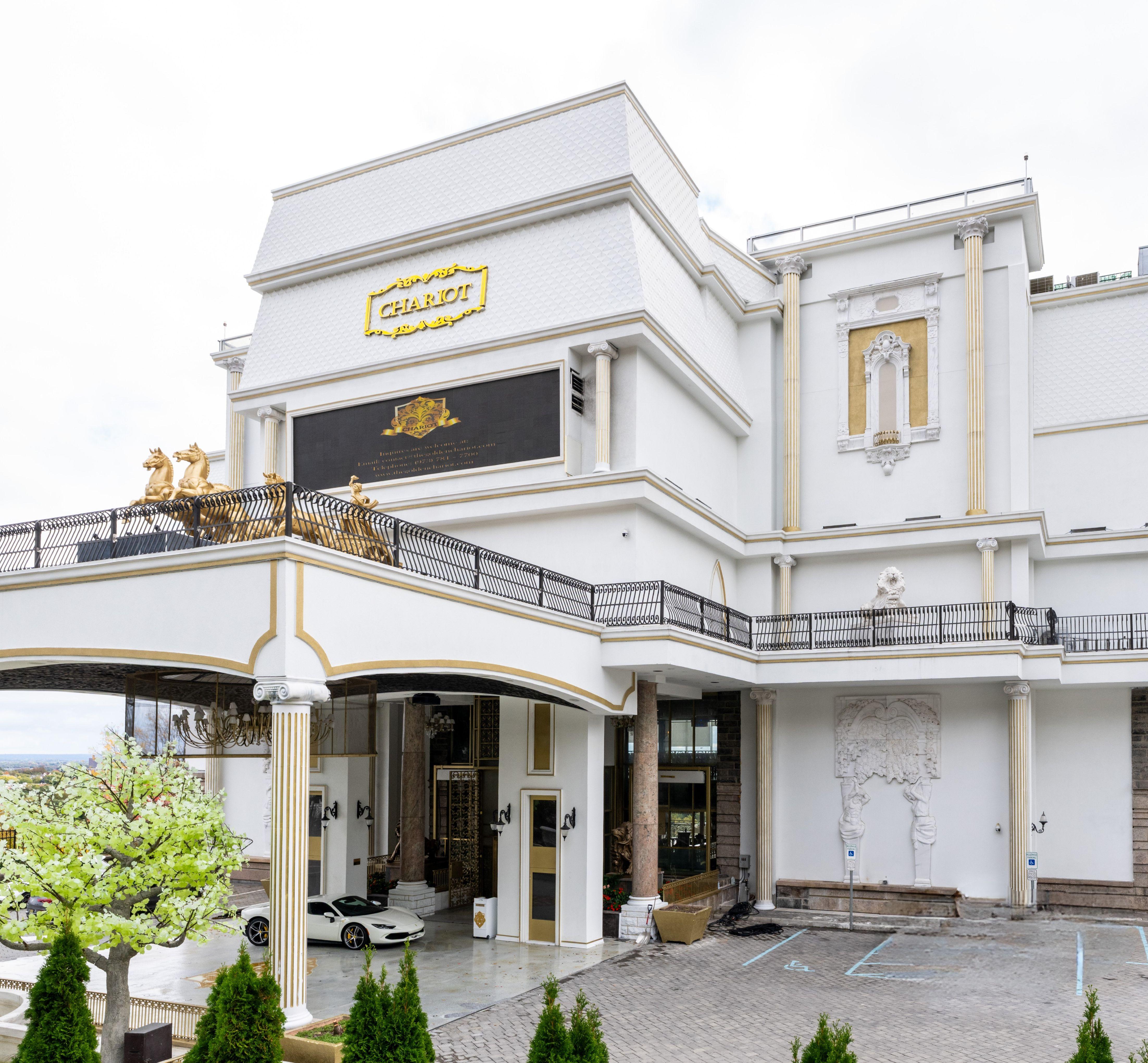 The Chariot is a striking luxury venue that combines dramatic architecture with refined elegance. Guests are welcomed into a grand, two-story ballroom defined by sweeping staircases, sparkling crystal chandeliers, and polished marble floors that reflect the warm glow of golden lighting. The room’s ornate columns, detailed ceiling accents, and black-and-gold mezzanine create an atmosphere reminiscent of a regal European palace. Designed for large celebrations, the ballroom offers an expansive open floor plan complemented by a wraparound balcony that overlooks the main level, adding both visual interest and additional seating options. Every detail of the space from its sophisticated ironwork to its impeccable lighting has been crafted to elevate the event experience.