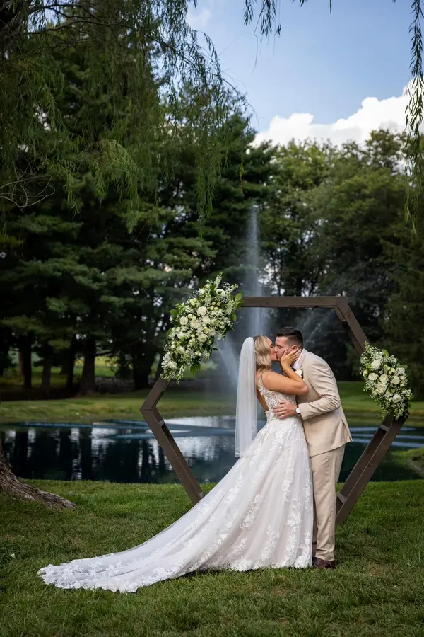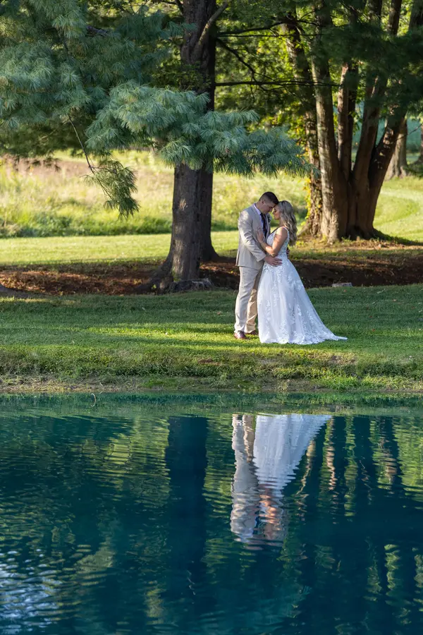 We have several outdoor ceremony sites on our property, including our pond with fountain and our front lawn overlooking surrounding fields.