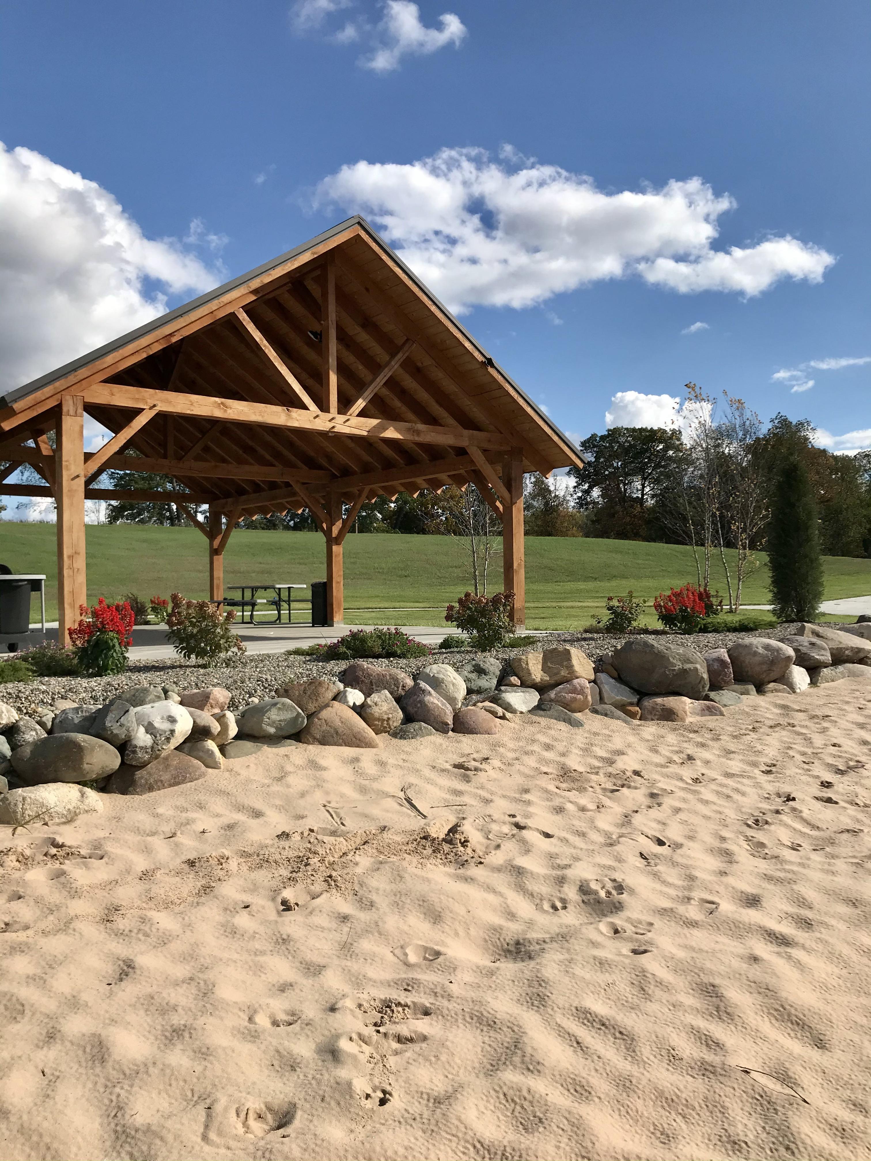 The pavilion is approximately 34’ x 22’, holding approximately 100 chairs. There is room for additional seating in the grass on each side.