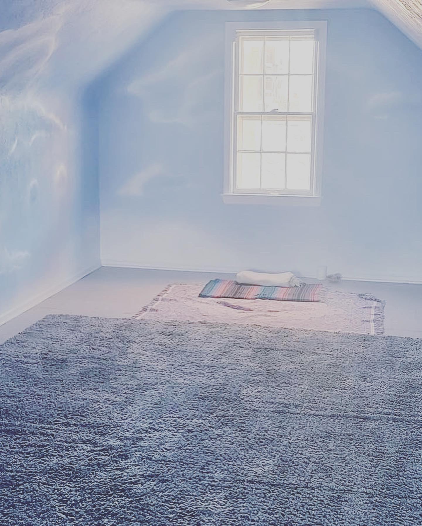 This loft space is painted with clouds all surrounding- we love as a meditation and gentle yoga class space, and is an excellent getting ready space option before your event!