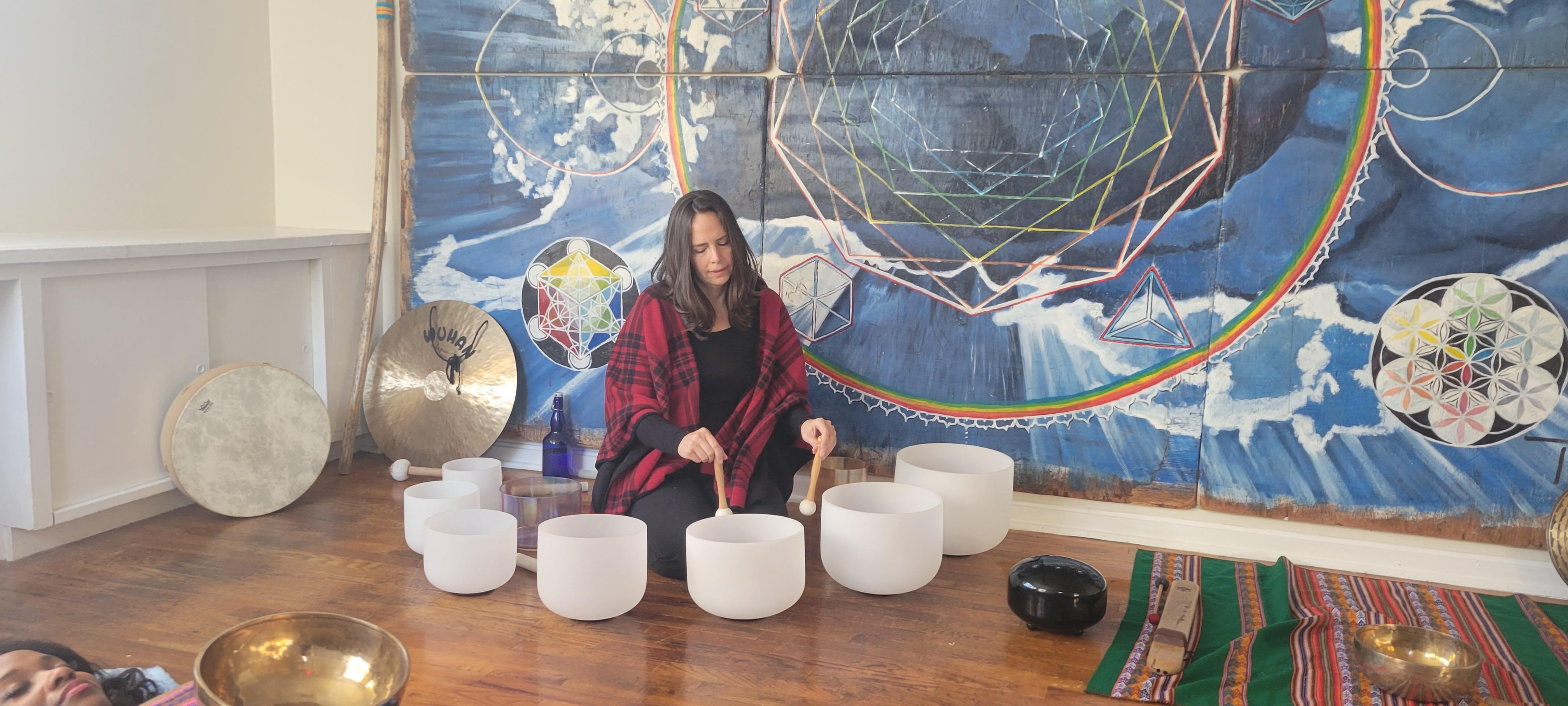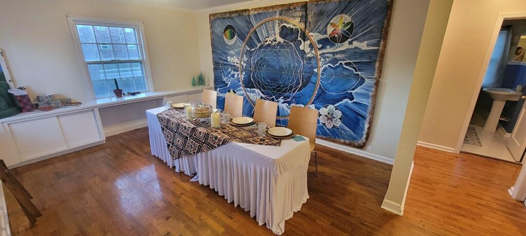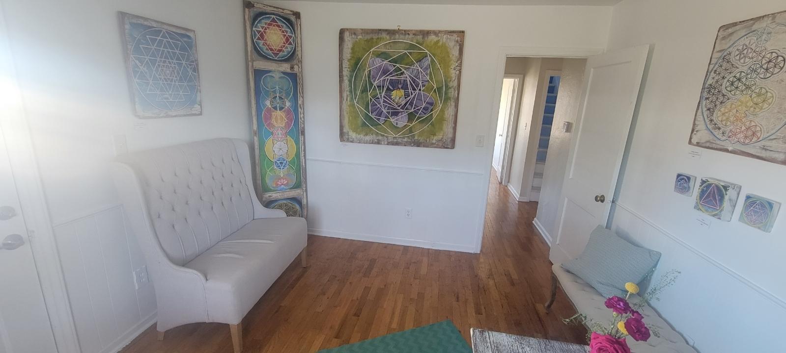 This space featured a big art piece along one wall, with blue tones and Sacred Geometry. Woof floors, and two windows for natural light.