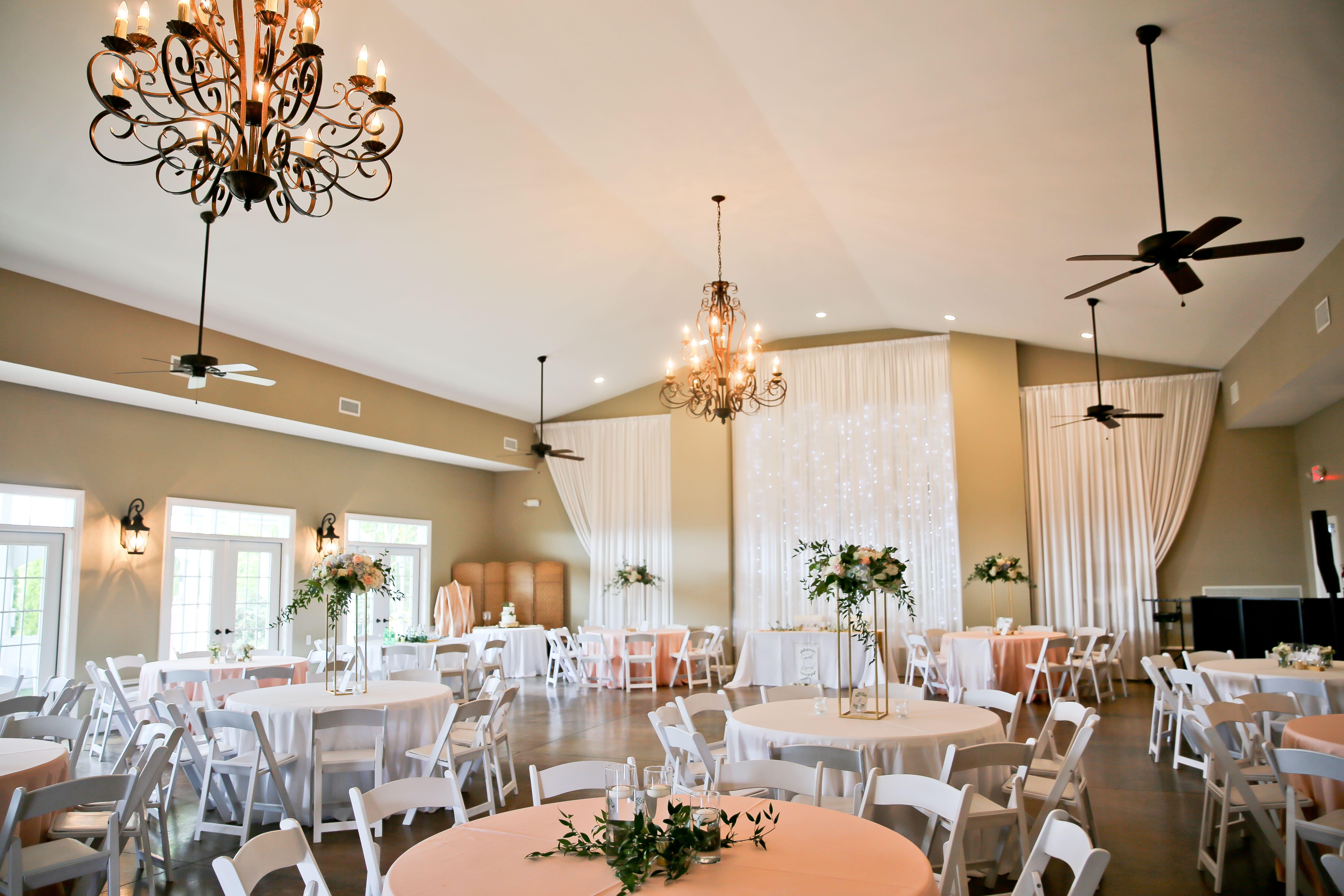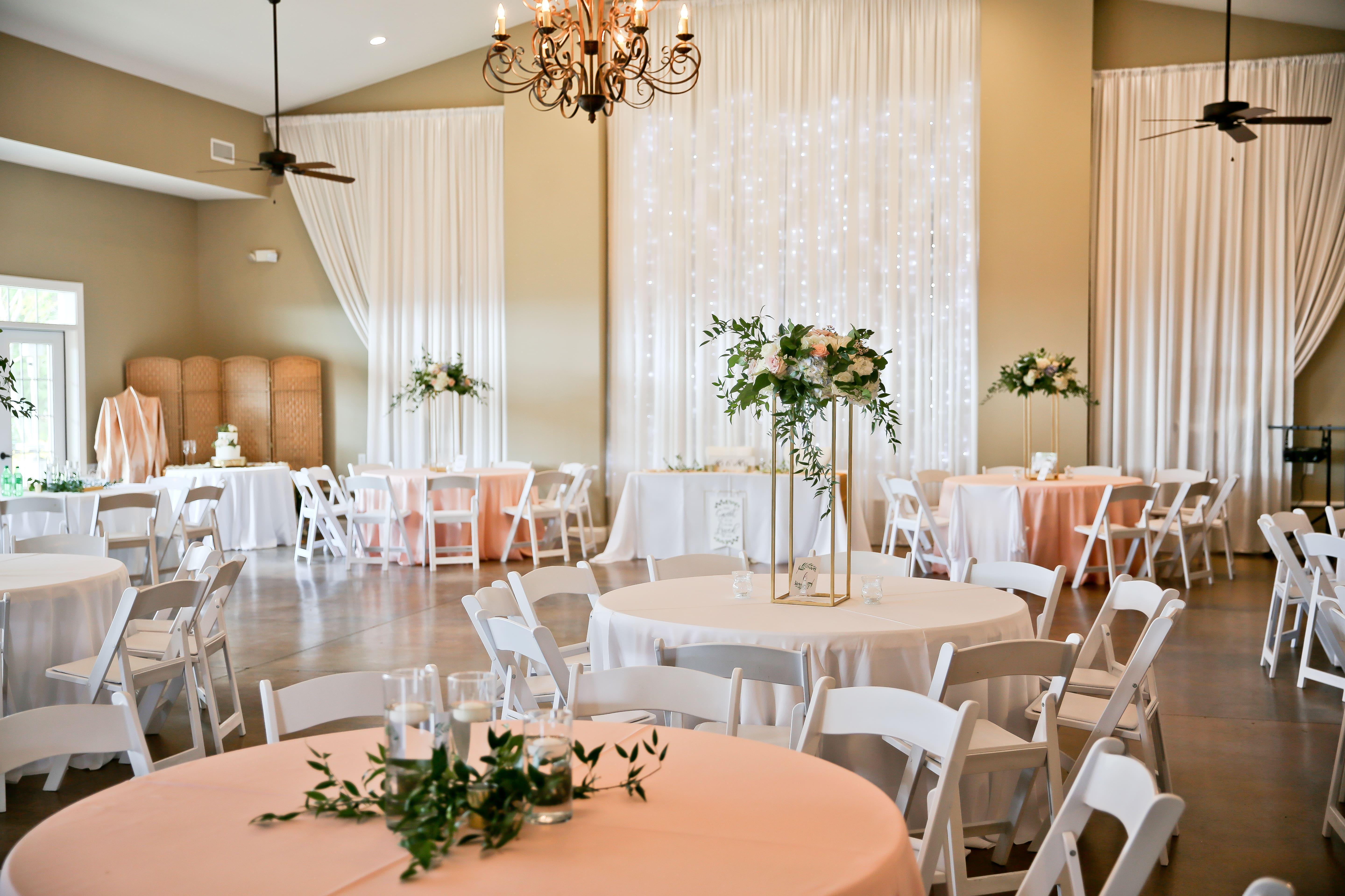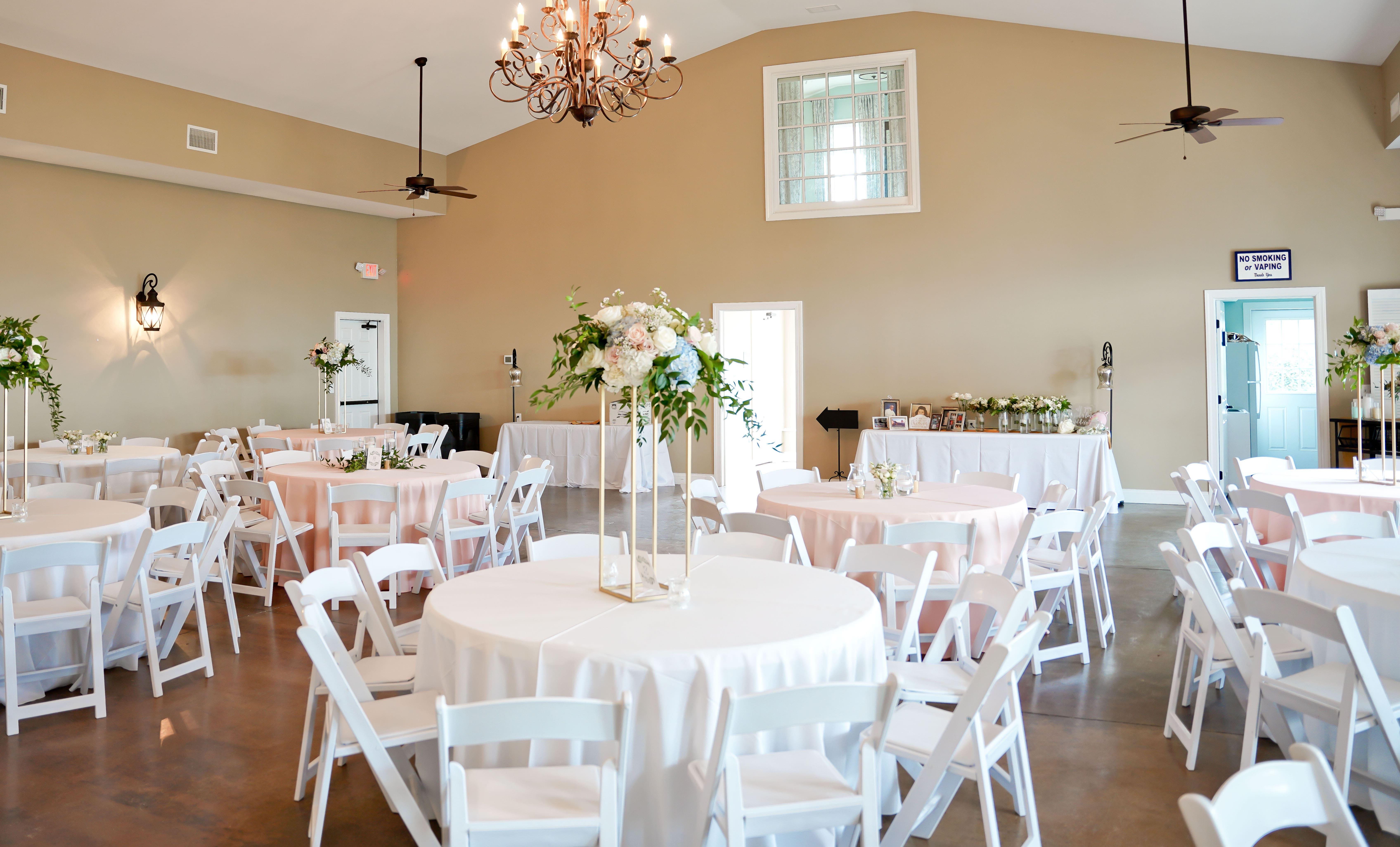 Included are round tables, white chairs, and linens. Couples can select their own preference for caterers, florists, and other vendors. The wedding fee at this venue includes 20 round tables, four rectangular tables, three round tables, and six cocktail tables. It also includes 400 white chairs and venue access for 12 to 15 hours, depending on the day of rental. There is plenty of space around the banquet hall for parking, and staff will be on-site to assist with party needs and event cleanup.