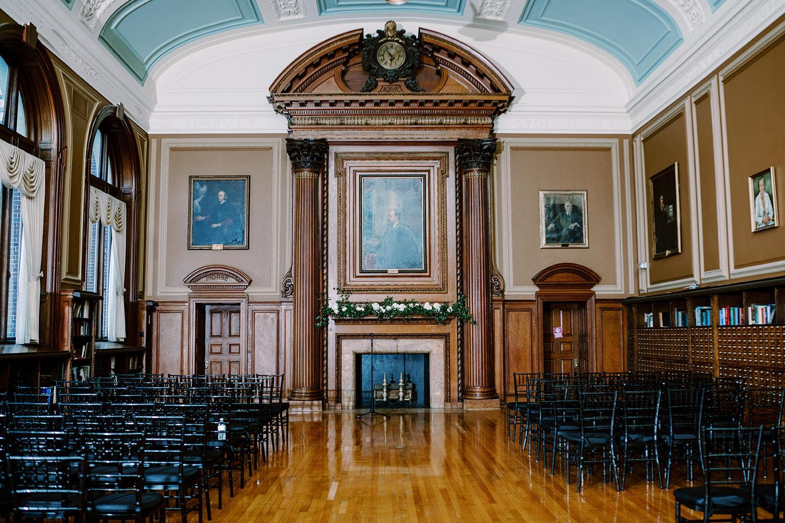 One of the building’s two grand halls, Ashhurst is a magnificent space detailed with a floor to ceiling mahogany carved mantle piece and grand clock. The thirty foot walls are lined with stunning inset book shelves and feature the College’s historic card catalogs. During the day, the ceiling-high windows allow light to flood the room creating a fresh and open space. Ashhurst works well in conjunction with Mitchell Hall for hosting larger occasions.