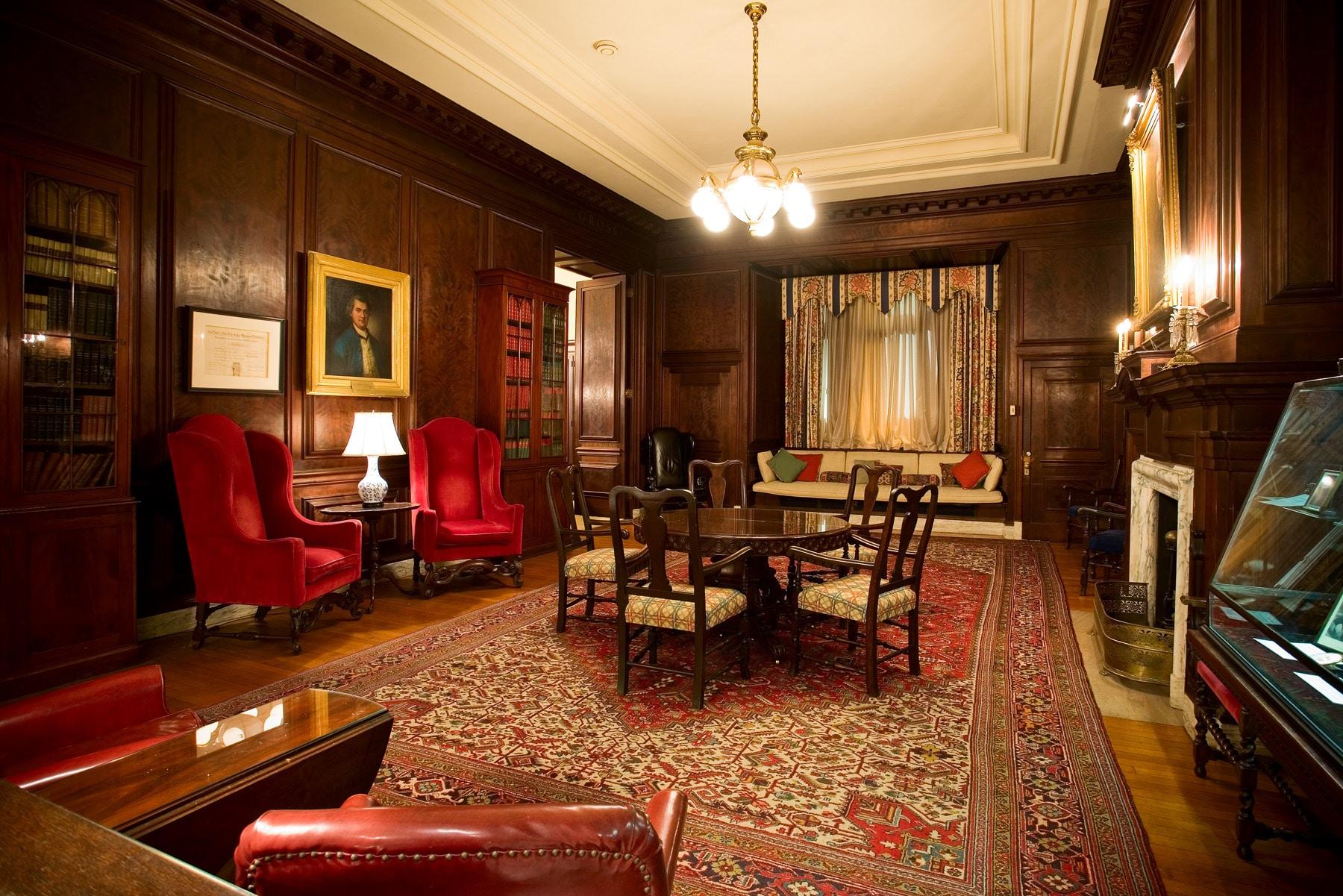 The mahogany-paneled walls, period furnishings, portraits and fireplace provide a comforting ambience for small dinners and socializing. This intimate setting is a beautiful contrast to the Rotunda, to which it adjoins.
