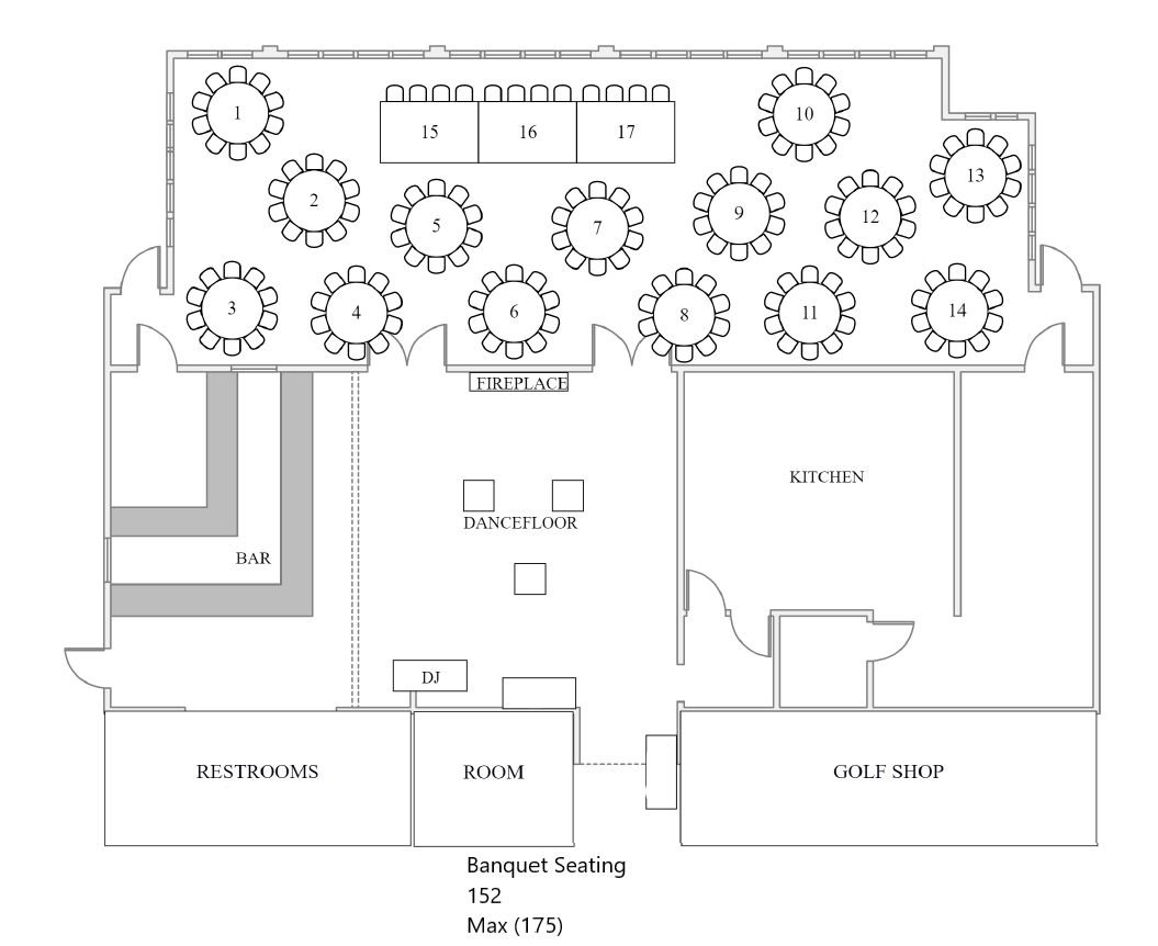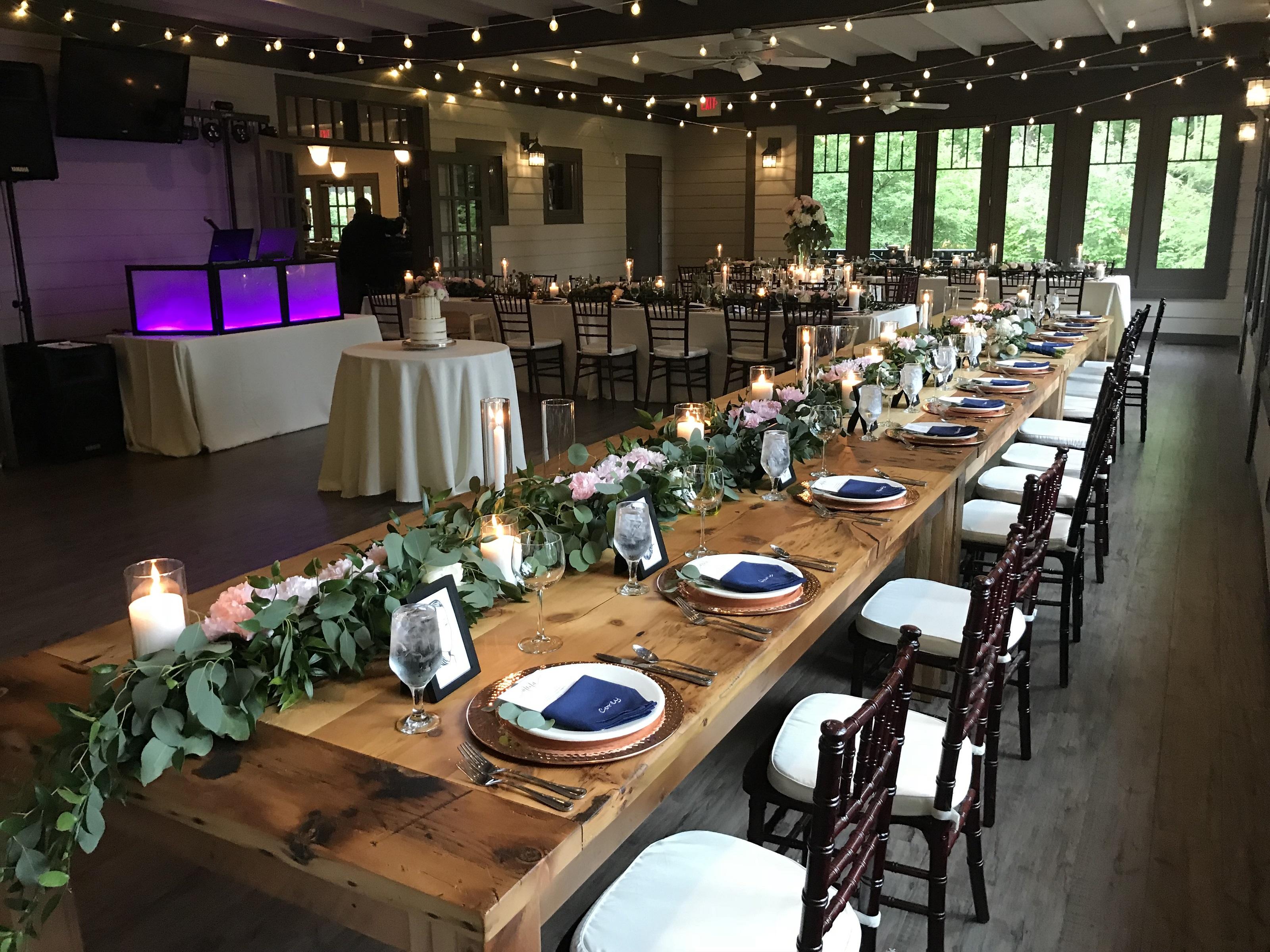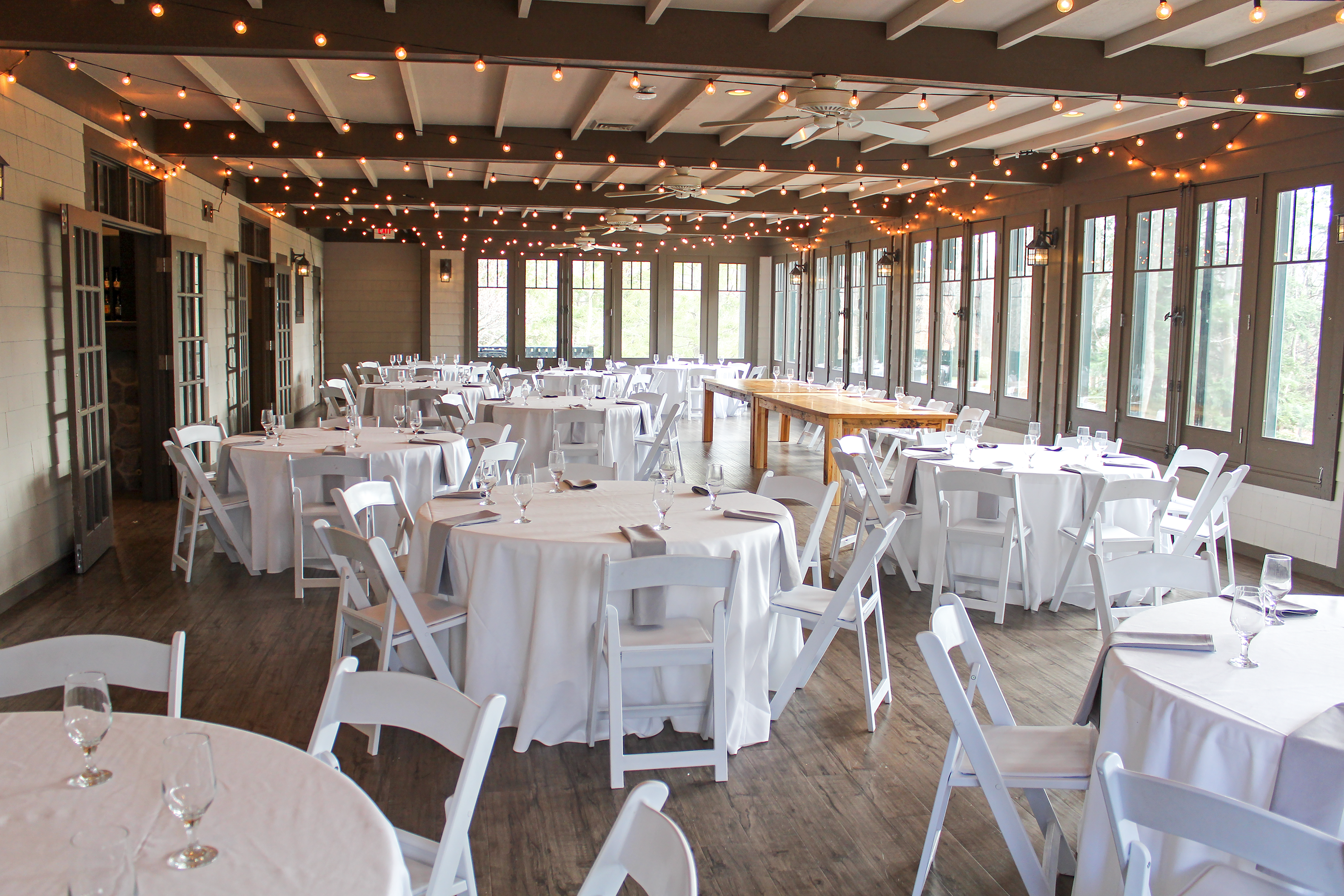 Bar, patio, fireplace, bridal room, large farmhouse tables, permanent market lights, floor-length white linen, patio with wooded golf course views.