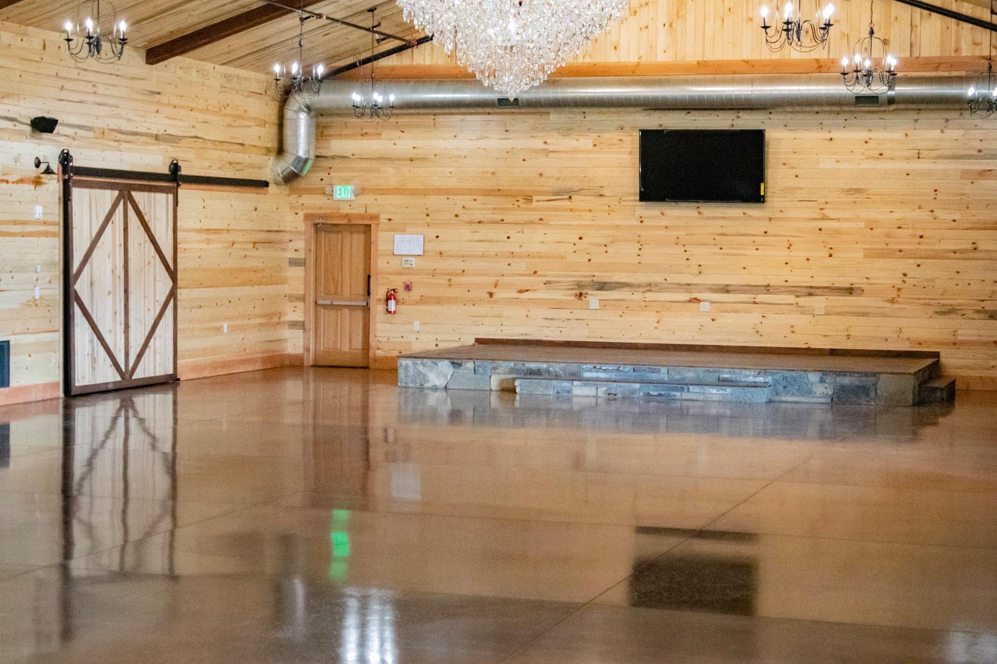 The Covey Events a Gathering Place - "It’s All About the Memories". Main entrance to The Covey, has side doors to the indoor/outdoor bar. The other side of the barn is the stage for your DJ or band. Surround sound speakers with a TV for a slideshow. Behind the sliding barn door is a spare room for storage.