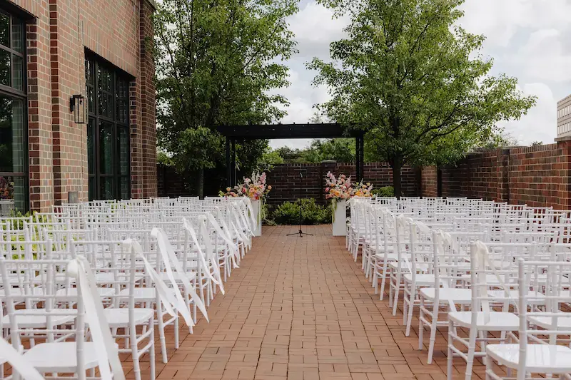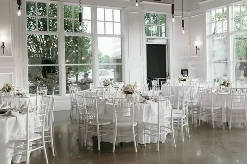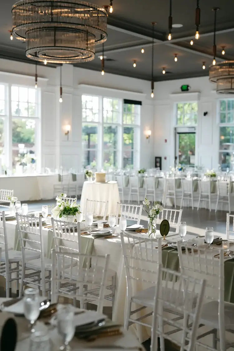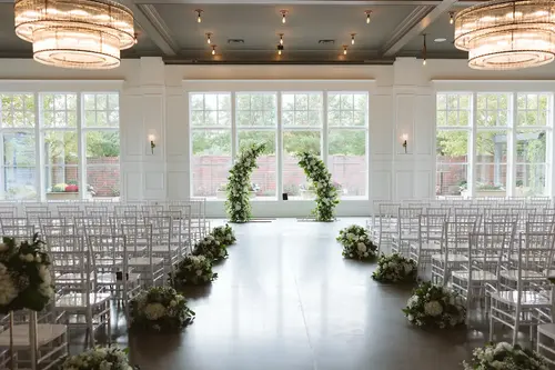 The Crawford offers beautifully designed spaces for every phase of your wedding, accommodating up to 250 seated guests or 325 standing guests. • Reception/Ceremony Hall: This spacious, brightly-lit hall (as seen in the images) is the centerpiece of the venue. It features soaring walls of tall windows that flood the space with natural light and a chic coffered ceiling accented by 66 signature hanging lights and stunning modern chandeliers. The room can be transformed into a sophisticated reception area with round tables or set up as a traditionally styled ceremony space with a breathtaking backdrop of windows. The sleek concrete floor and white paneled walls provide a refined, clean canvas for any decor. • Outdoor Patio: Step outside to our private, brick-lined patio for an open-air ceremony, cocktail hour, or late-night mingling. The space is framed by a brick exterior and features a black pergola over the ceremony area, blending urban style with greenery for a truly memorable moment.
