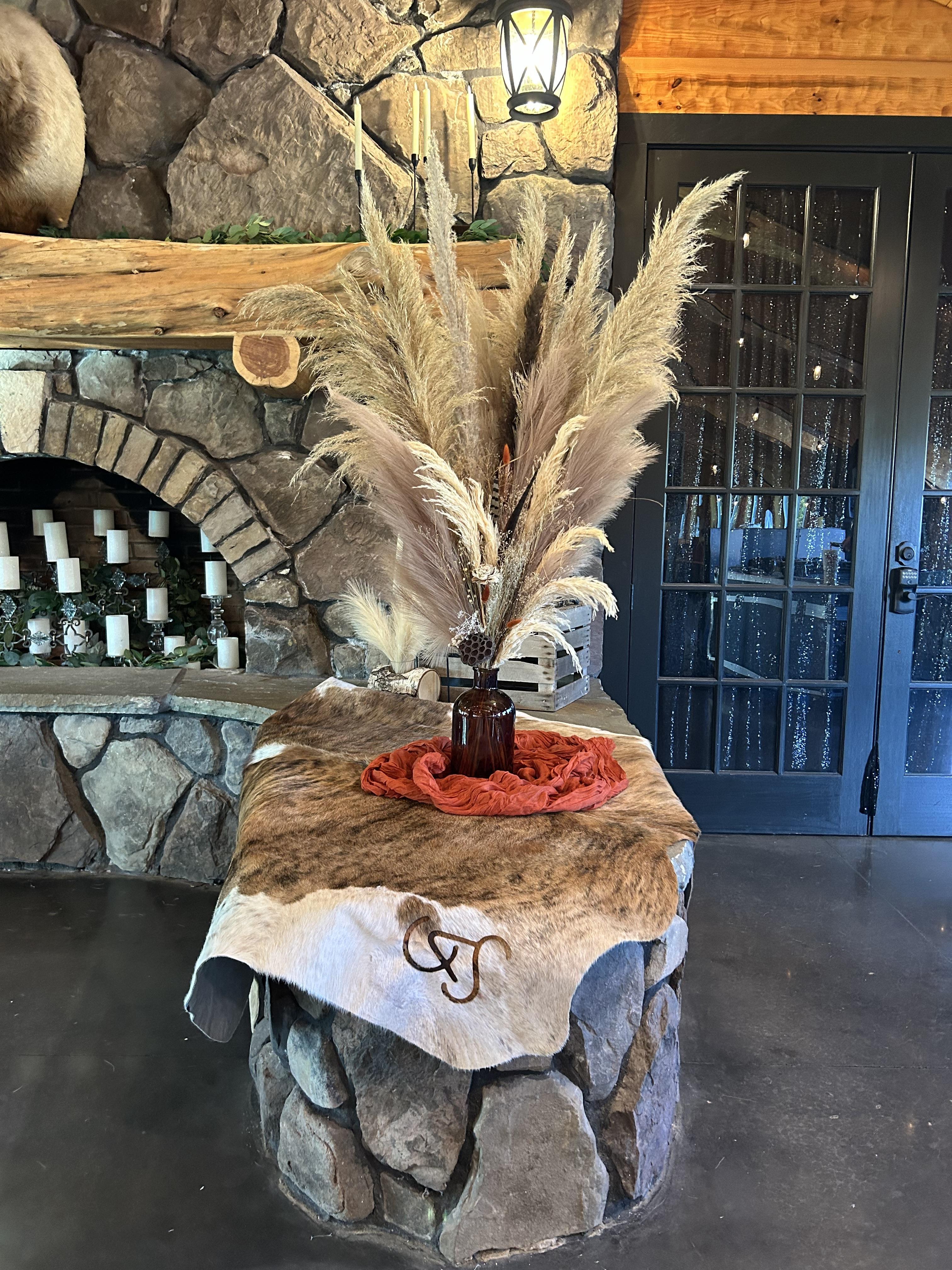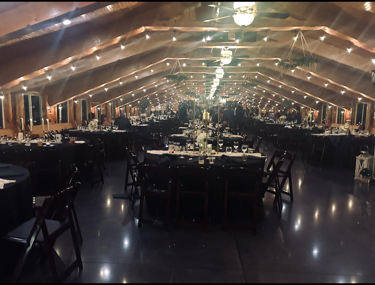 The Moose Room is an intimate 4000sf room embellished with icicle lights and chandeliers complete with a bar, elegantly stained concrete tables with leather bar stools. Relax on our leather sofas in front of another massive rock fireplace. This is a great room for rehearsal dinners and cocktail reception while the wedding party is taking pictures. The Drake room is a 6000 square-foot open ballroom with a magnificent fireplace, black polish concrete floors and ceiling draped with café lights.
