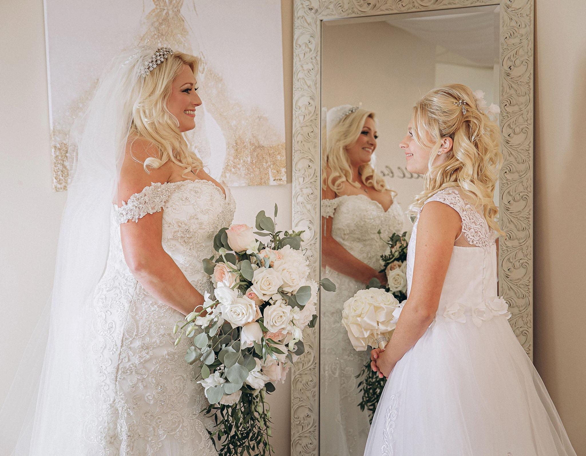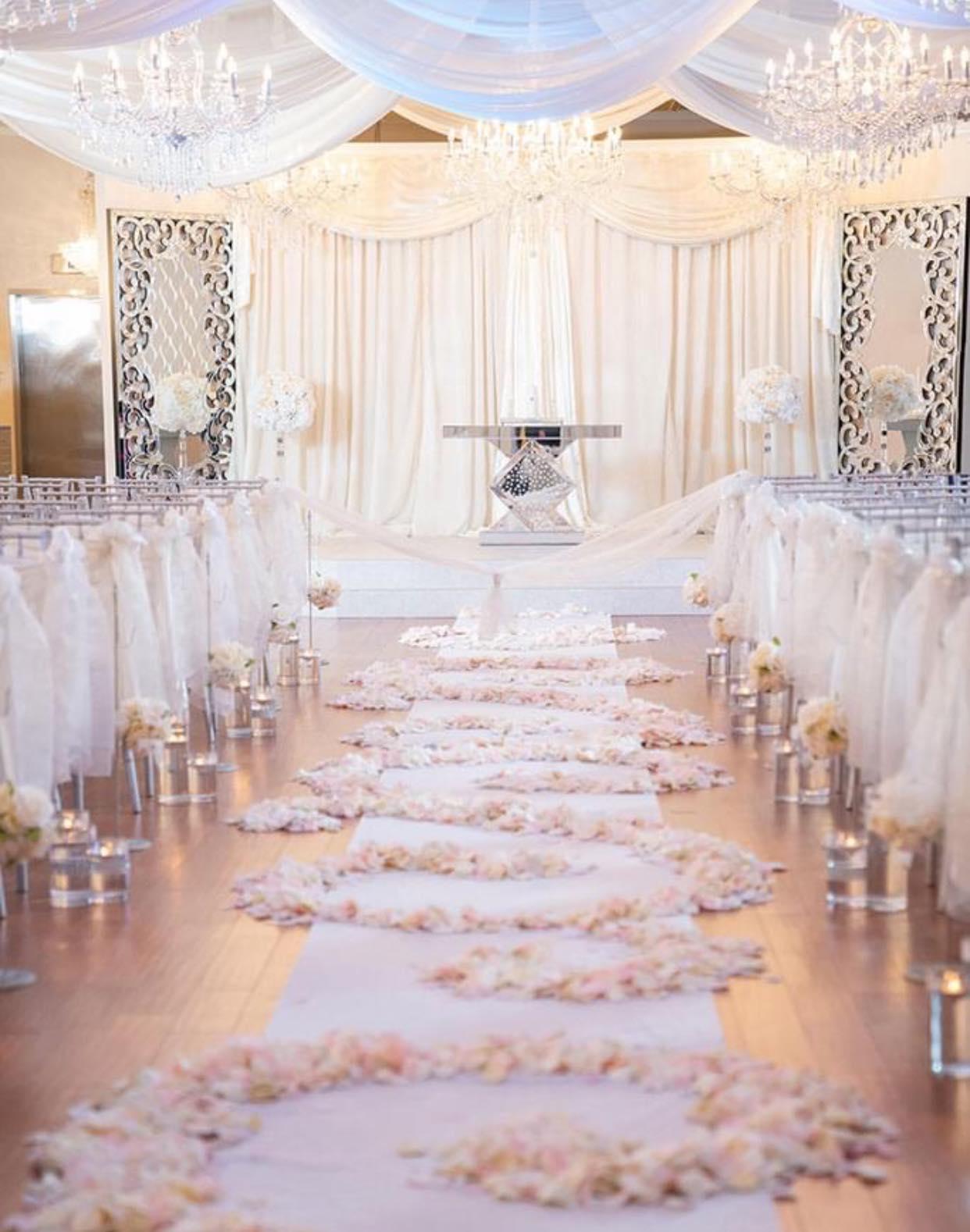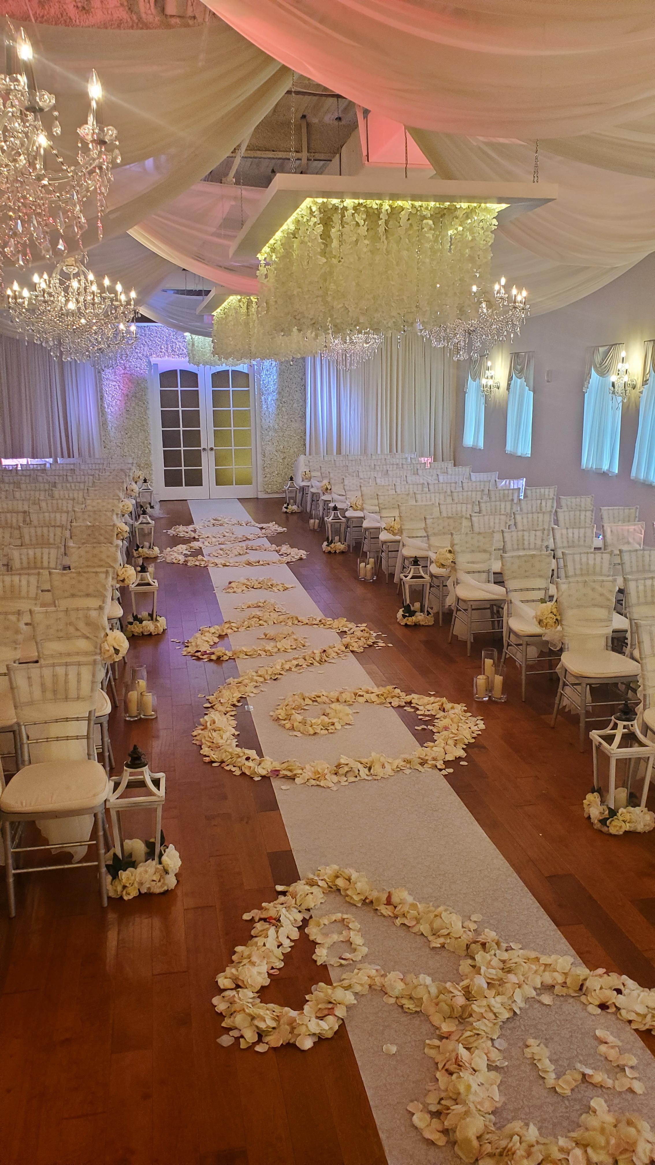 - 9 gorgeous crystal chandeliers - ceiling drapery - canopy of hanging wisteria florals - flickering candles down the aisle - accenting up lights - full stage area - accenting aisle floral arrangements - mirrored glass unity table - hydrangea floral wall - beautiful French door grand entrance - silver Chiavari chairs dressed in ivory sashes - VIP Suites for our most important Wedding Party members complete with plush seating areas, storage, full length mirrors, and vanity