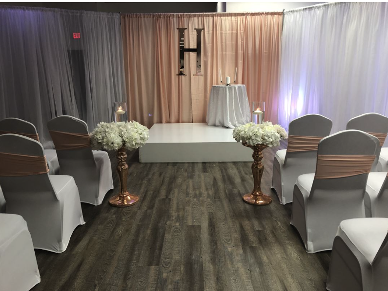 Features Atmosphere/Decor: Classy! All white flooring and walls, perfect blank canvas for your theme, design or decor! Over 4,000 square feet of space. Floor Covering: White Polished Epoxy Special Features: Bling wall sconces on main wall, drop ceiling.